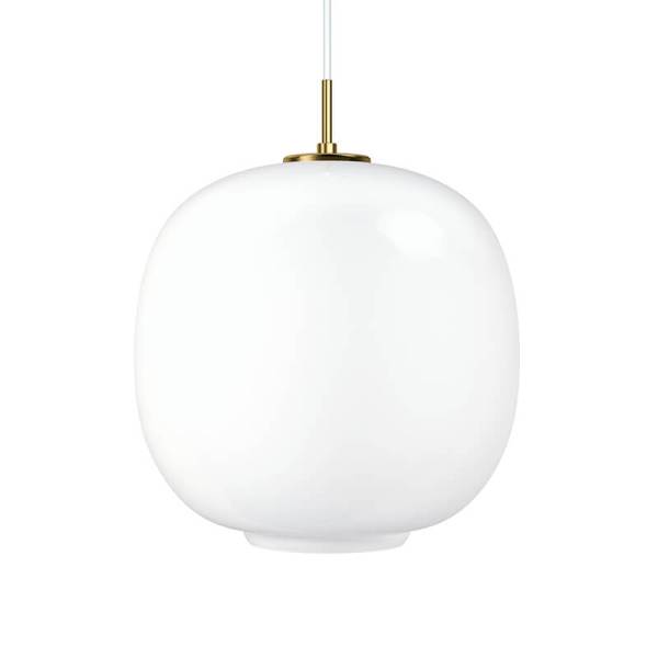 Materiaal: Scherm: Mondgeblazen, glanzend wit opaalglas. Pendelbuizen: Geborsteld messing.