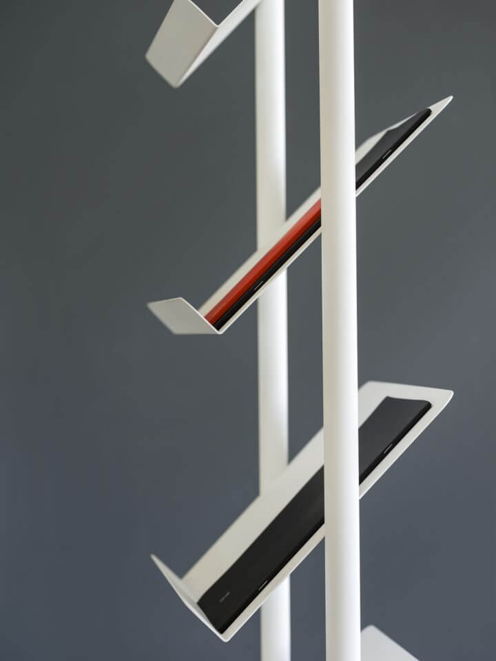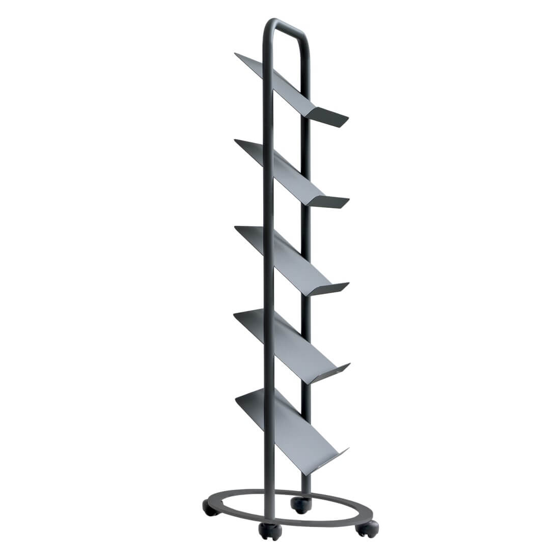 Brochurehouder Spring B1 is ontworpen door Pelikan & Co voor VanEsch. Deze display maakt deel uit van het flexibele garderobesysteem Spring. Evenals bij de andere onderdelen van dit door Pelikan & Co. ontworpen systeem valt de krachtige uitstraling op. De vijf robuuste legborden versterken dat beeld. Door de vier zwenkwielen is de brochurehouder gemakkelijk verplaatsbaar.