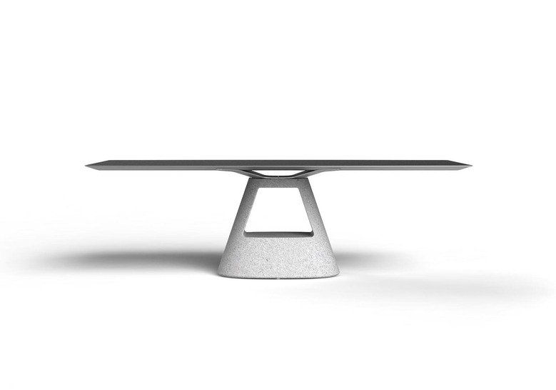 Unieke tafel van Konstantin Grcic voor BD Barcelona. Het blad is van geëxtraheerd aluminium met open uiteinden. Optioneel kan het bovenblad worden gelamineerd met gevernist eiken look. Er is een keuze uit een eiken onderstel, een onderstel van beton en een RVS onderstel.