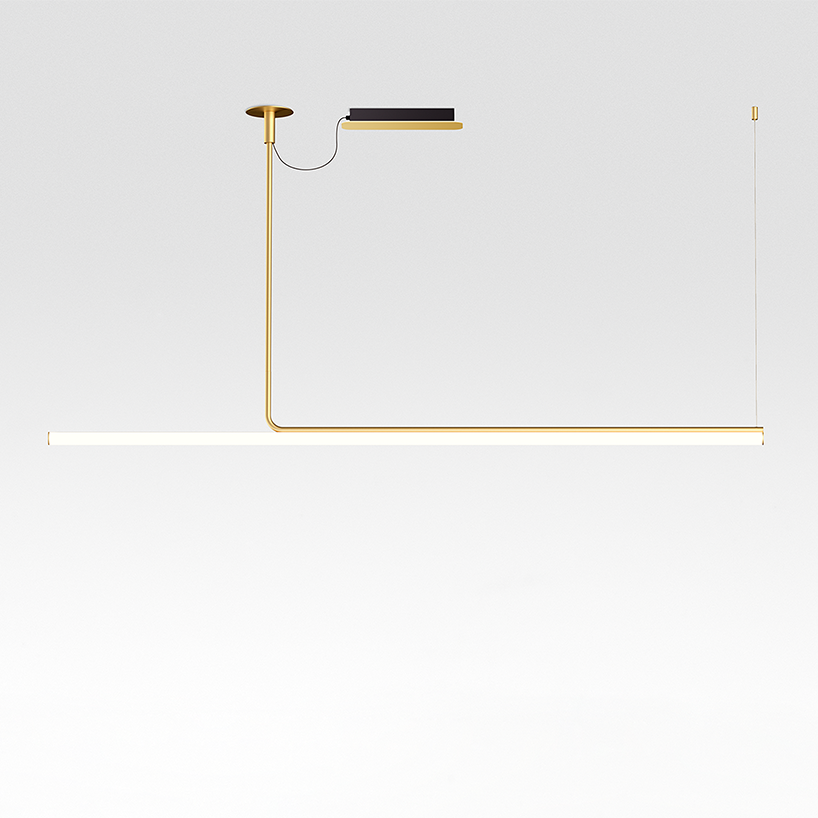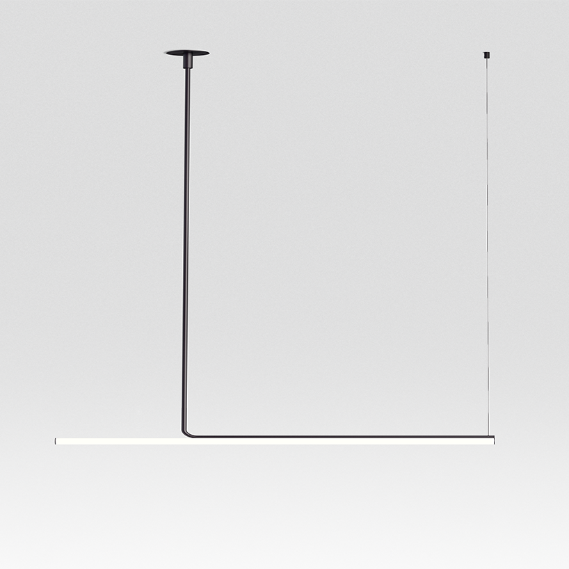 Het ontwerp komt voort uit eenbuisvormige structuur met zachtelijnen die aan het plafond vastzit,waardoor het licht kan neerdalen enelk type project zachtjes kanverlichten. Dit verlichtingssysteem isverkrijgbaar in vier vooraf ingesteldelengtes, van 120 tot 315 cm. Metverlengingen van 40 en 60 cm. Opdie manier kun je hun afstand tot hetplafond aanpassen om visueelononderbroken composities tecreëren.