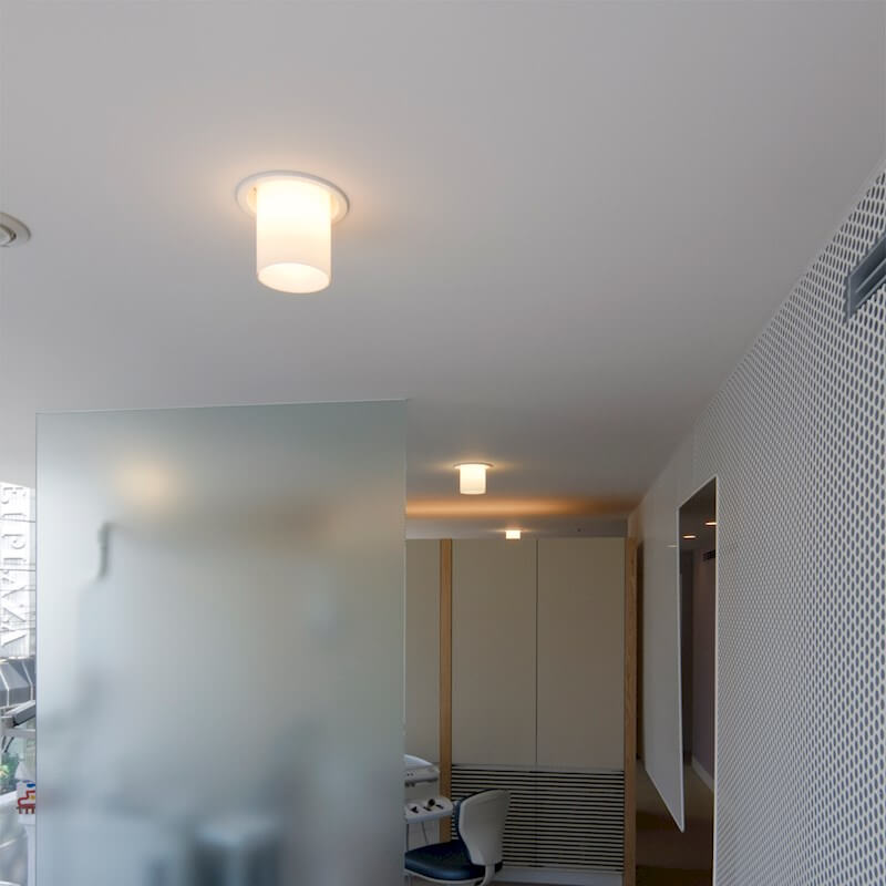 De lichtspreiding is symmetrisch en naar beneden gericht. De verticale cilinder van 3 lagen mondgeblazen opaalglas zorgt voor zachte en aangename verlichting op het plafond rond de armatuur en voor het reduceren van schittering voor voorbijgangers.