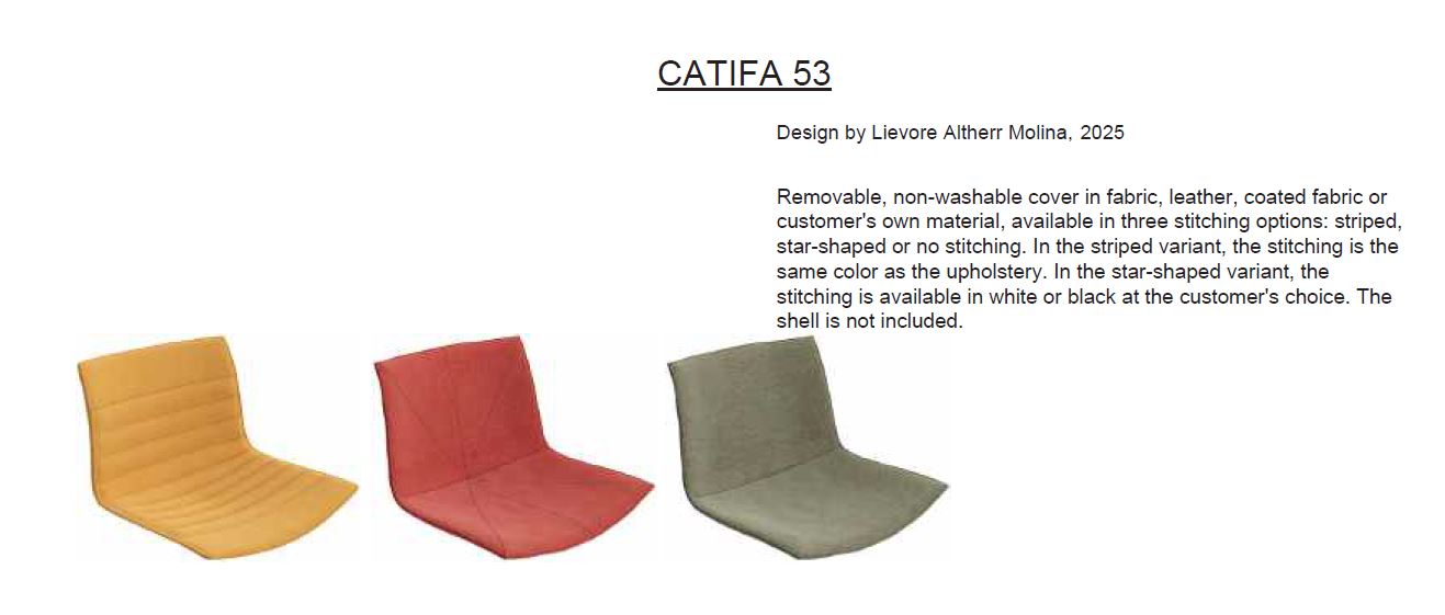 Losse hoes voor de kunststof uitvoering van de Catifa 46 & 53 van Arper. Er zijn 3 verschillende uitvoeringen mogelijk. Vele stoffen en leer mogelijk.