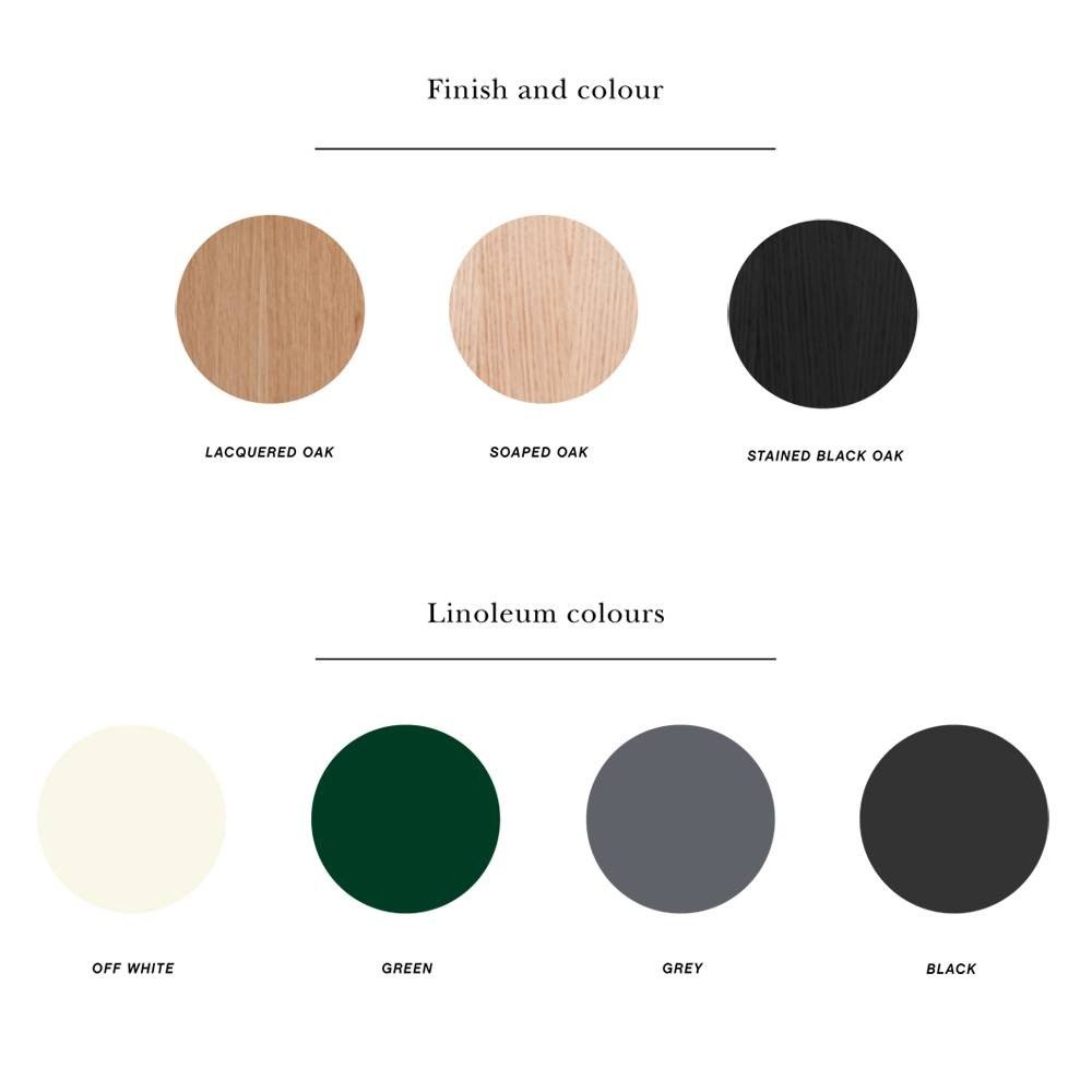 - Frame transparant gelakt eiken: transparant gelakt eikenfineer, zwart linoleum, groen linoleum, grijs linoleum, off white linoleum of wit laminaat