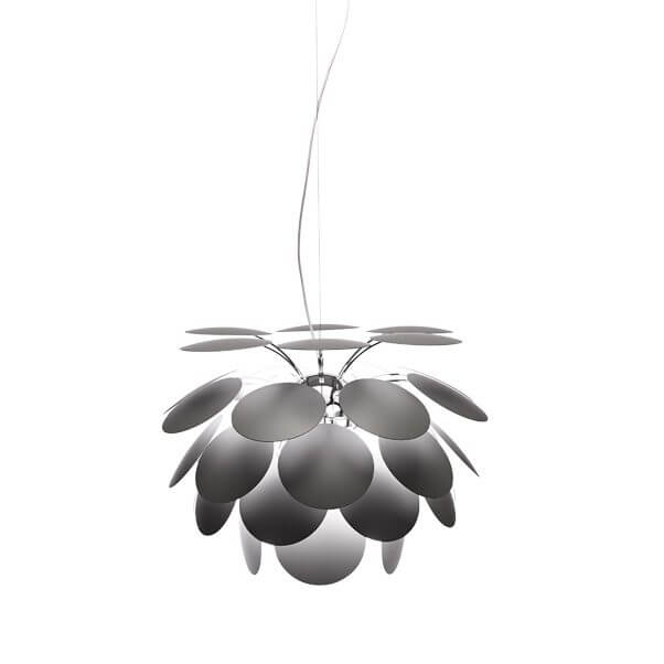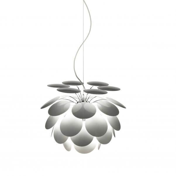 De Discoco Hanglamp is ontworpen door Christophe Mathieu voor Marset. De lamp bestaat uit 35 ABS schijven gelakt in helder wit RAL9003, mat beige RAL1001, mat grijs RAL 7037 of zwart RAL9004 met gouden binnenkant. Deze weerspiegelen op een bijzondere manier de interne lichtbron waardoor er een prachtig lichtspel ontstaat. De hanglamp is verkrijgbaar in 5 afmetingen (zie abeelding).