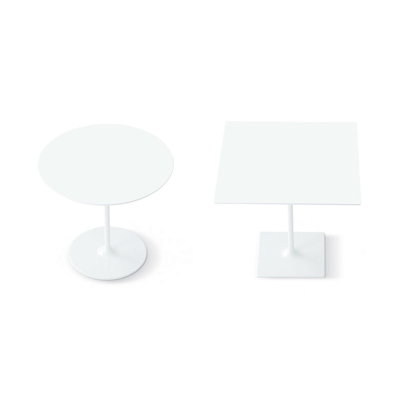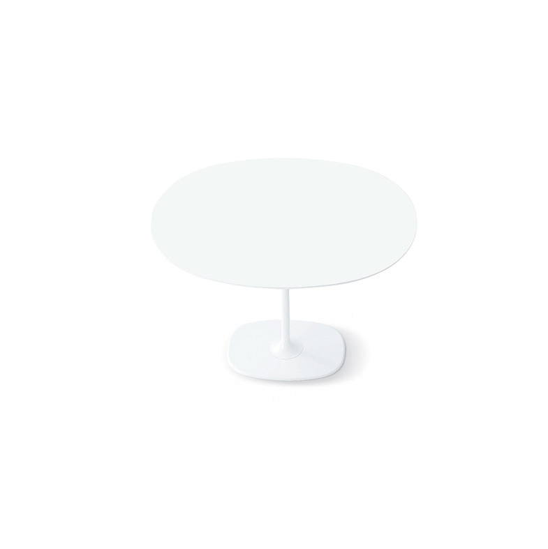 Het Dizzie tafelprogramma is ontworpen door Lievore Altherr Molina voor Arper. Uitgebreide tafel collectie met witte MDF bladen, kolomvoet chroom of wit gelakt.