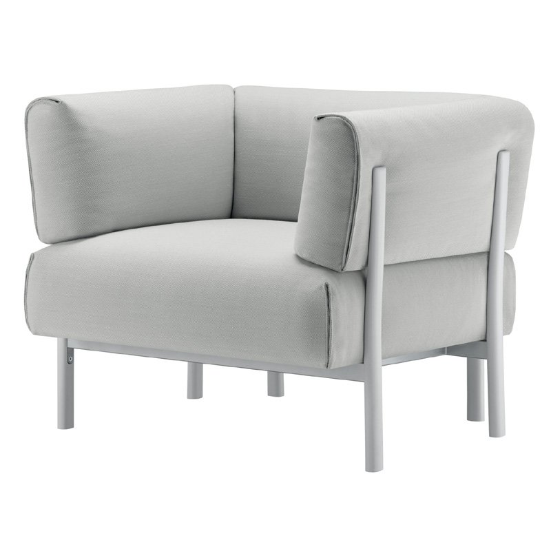 Compacte volumes. Uitzonderlijke visuele zuiverheid. Als kenmerkend element de aluminium poten waaraan de armleuningen en de rugleuning worden vastgemaakt.