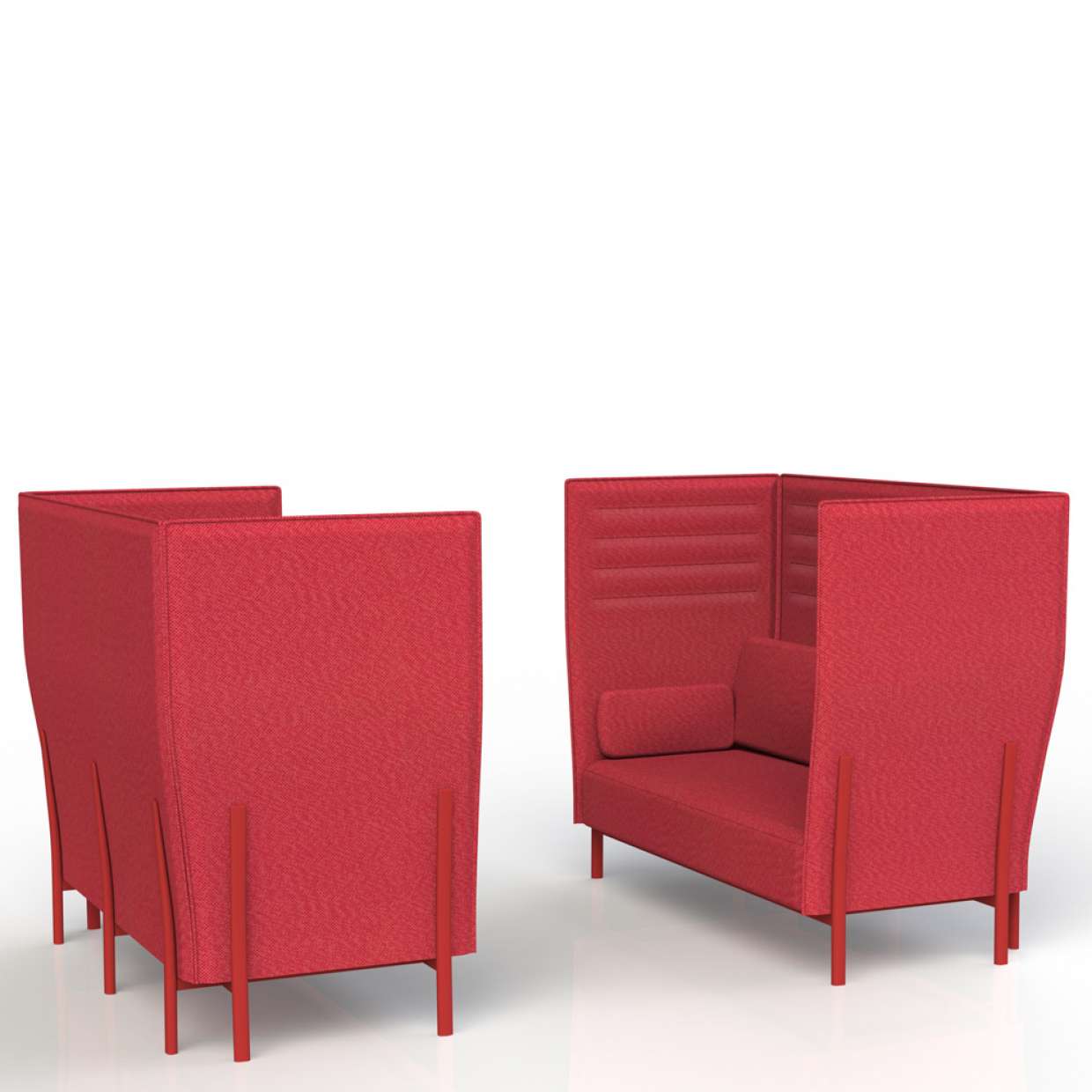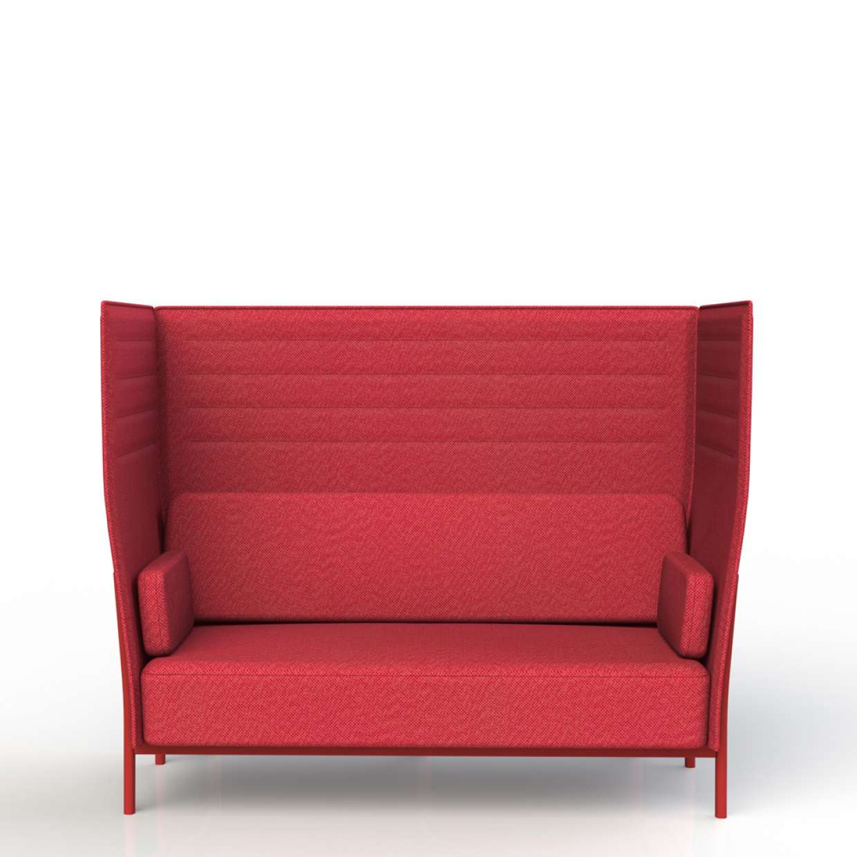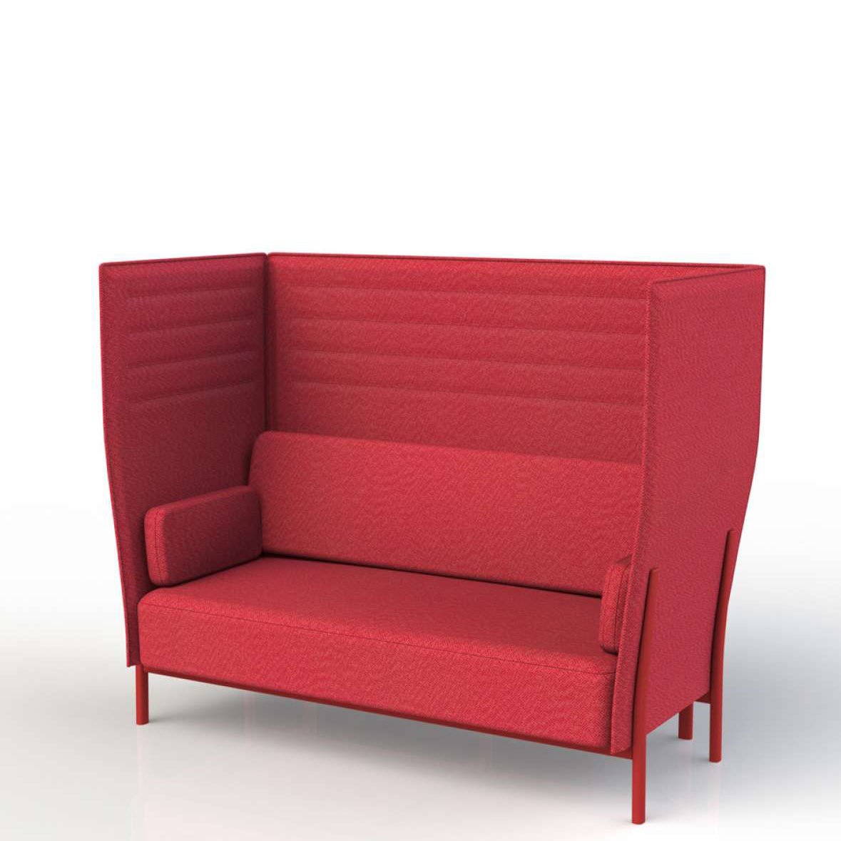 Divan met hoge rug in twee maten. De poten zijn van gegoten aluminium, het frame is van staal. Zitting, rugleuning, armleuningen en panelen zijn van polyurethaan kleed met textiel.
