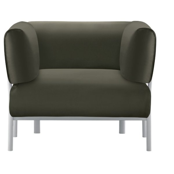 Compacte volumes. Uitzonderlijke visuele zuiverheid. Als kenmerkend element de aluminium poten waaraan de armleuningen en de rugleuning worden vastgemaakt.