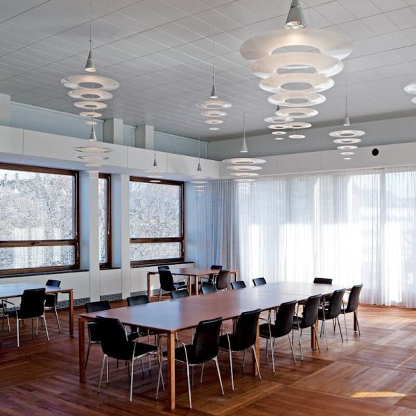 De Enigma is ontworpen door Shoichi Uchiyama voor Louis Poulsen. De armatuur verspreidt een schitteringsvrij, zacht en comfortabel licht dat naar beneden is gericht. Het scherm ontwerp waarborgt een gelijkmatige verlichting van de oppervlakte. Het matte oppervlak aan de bovenkant verspreidt het licht, terwijl het glanzende oppervlak aan de onderkant een optimale weerkaatsing verzekert.