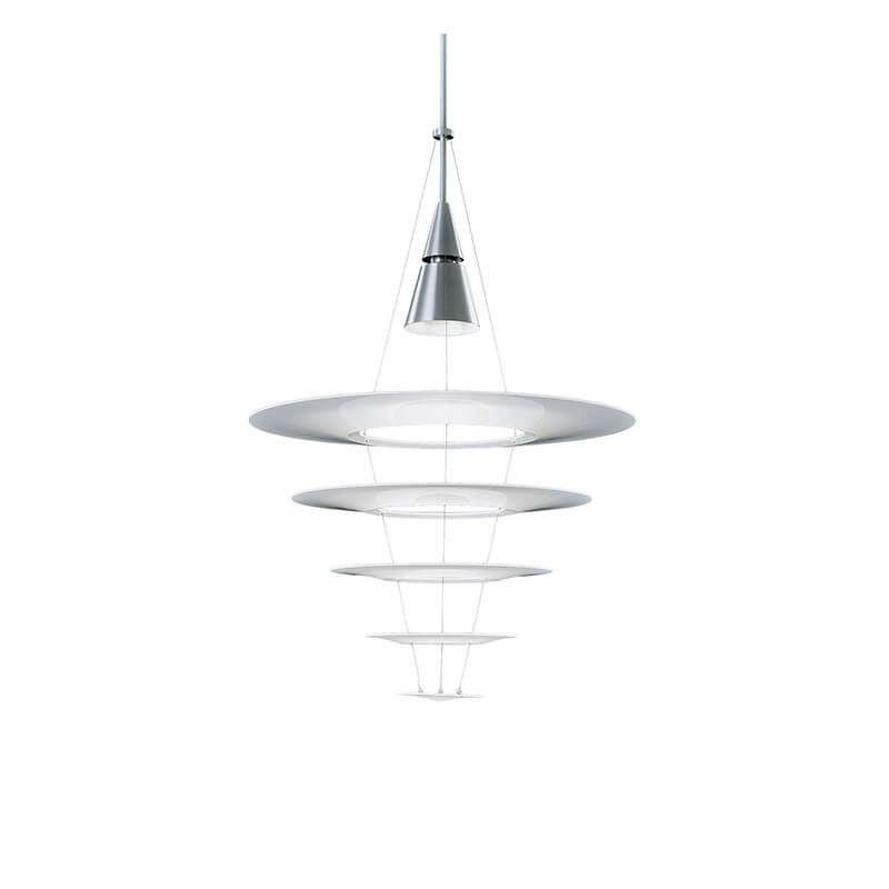 Materiaal: Kegel: natuurlijk geanodiseerd geborsteld aluminium. Kabel: roestvrij staal. Schermen: mat acrylaat. Pendelbuis: geëxtrudeerd aluminium, geborsteld en gelakt/geanodiseerd.