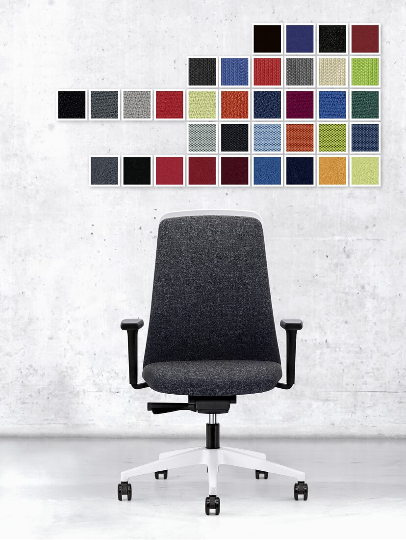 De Every is leverbaar met zwart of wit kunststof.Er zijn verschillende stoffen mogelijk, maar ook leer behoort tot de mogelijkheden. Hierdoor kan de bureaustoel ook qua uiterlijk goed aangepast worden aan de kantoorruimte.