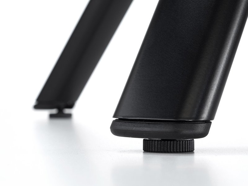 Tafel met basis samengesteld uit aluminium getrokken buizen. Poten in gefineerd hout of voorzien van poedercoating met verstelbare nylon voetjes.