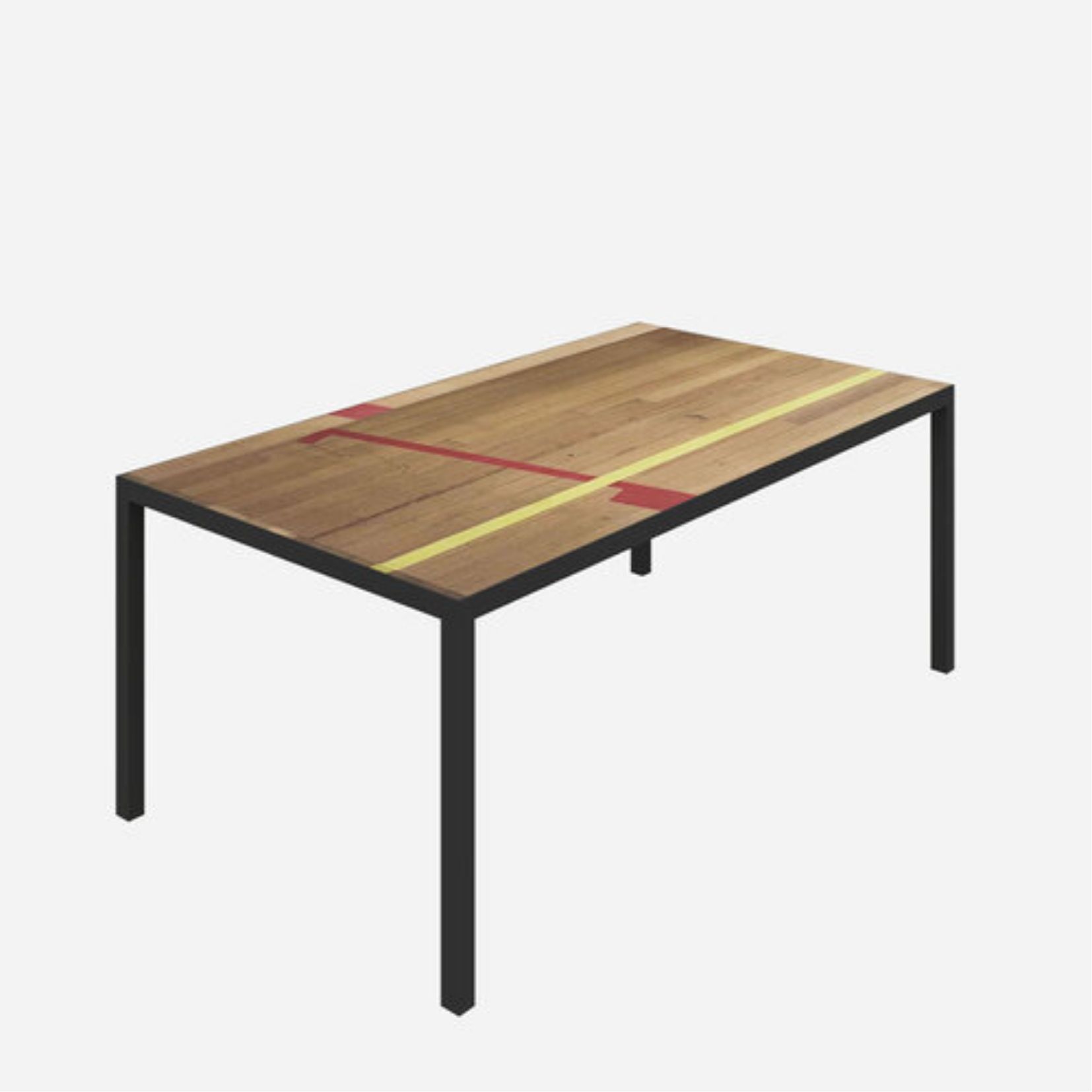 U kunt kiezen tussen een schuin of recht frame van kanonstaal. Poedercoating van het frame in diverse kleuren is ook mogelijk. De combinatie van het stalen frame en het gymfloor tafelblad zorgt voor een industrieel, sportief en uniek interieur, dat een gespreksonderwerp zal zijn in ieders interieur.