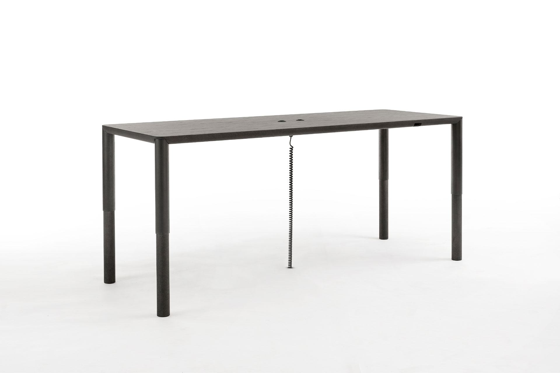 Flexibiliteit is een breed concept waar deze in hoogte verstelbare tafel één praktisch antwoord op biedt. Zo kan hij dienstdoen als vergadertafel, maar even goed als werk- of teamtafel. En omdat dit geen typische in hoogte verstelbare tafel is, is hij zelfs geschikt als eettafel. Het slimme van deze tafel zit ‘m in de poten. Hierin zit zowel een motortje als een mechanisme waarmee de hoogte kan worden aangepast. Een accu zorgt voor maximale flexibiliteit. In plaats van aan kabels gebonden, wordt deze tafel zo ‘mobiel’. Je kunt hem makkelijk verplaatsen naar de plek waar de omgeving om vraagt.