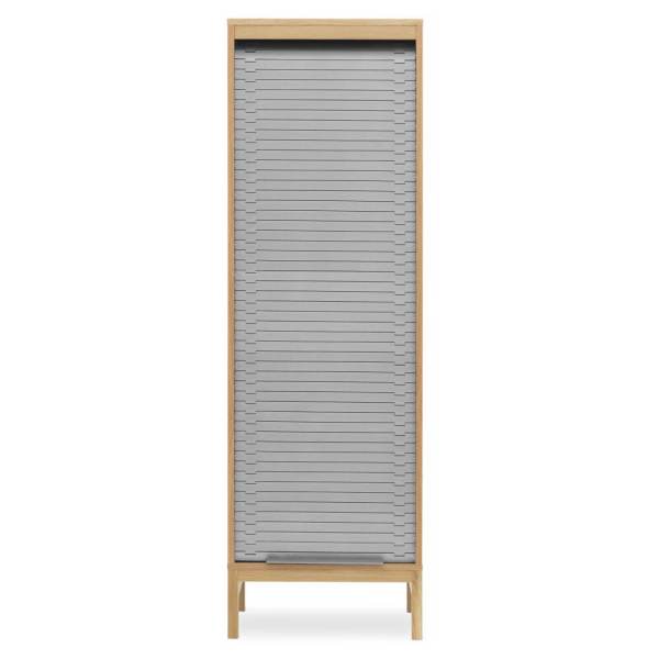 De Jalousi high van Normann Copenhagen is ontworpen door Simon Legald. Inspiratie voor deze roldeurkast haalde hij onder andere uit horloges, transportbanden en meubels uit de jaren 50.