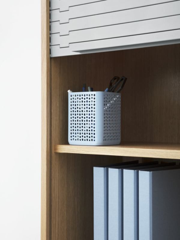 De Jalousi high van Normann Copenhagen is ontworpen door Simon Legald. Inspiratie voor deze roldeurkast haalde hij onder andere uit horloges, transportbanden en meubels uit de jaren 50.