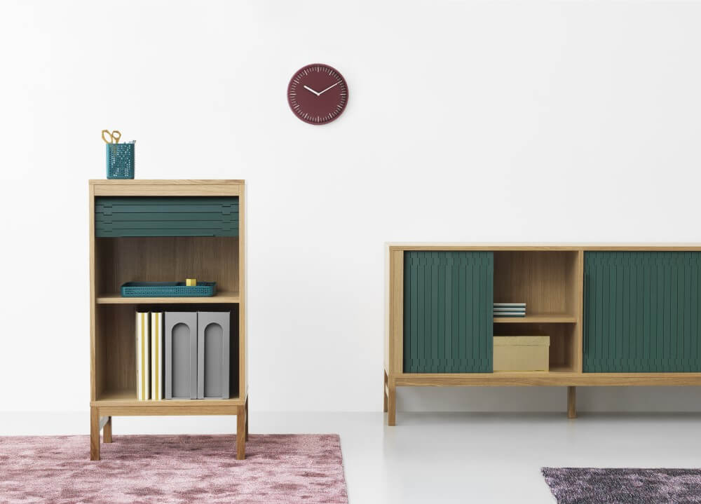 De Jalousi low van Normann Copenhagen is ontworpen door Simon Legald. Inspiratie voor dit roldeurkastje haalde hij onder andere uit transportbanden, horloges en meubels uit de jaren 50.
