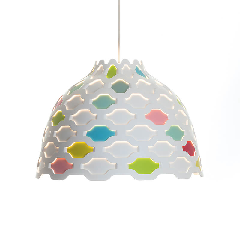 De armatuur straalt hoofdzakelijk naar beneden gericht licht uit. Het geperforeerde patroon van het scherm zorgt voor zachte verlichting rondom de armatuur. Tevens, draagt de perforatie bij aan het op een decoratieve manier verlichten van de buitenkant van het scherm, wanneer het is ingeschakeld, waardoor de contouren van de armatuur gehandhaafd blijven ongeacht of het is ingeschakeld of uitgeschakeld. De lichtbron is omgeven door een opalen diffuser, dat waarborgt dat de armatuur 100% verblindingsvrij is, en dat de armatuur geschikt is voor verschillende soorten lichtbronnen die zorgen voor dezelfde lichtspreiding en comfort. En tenslotte, laat de vorm van de diffuser een prachtig uitzicht toe in de toekomst.