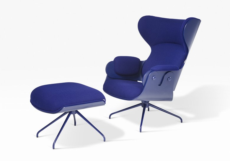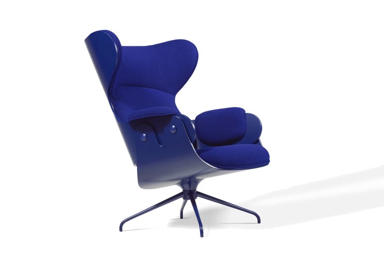 De gegoten aluminium draaivoet en het 4-poots onderstel zijn gelakt in een matte zijdeglans lak. De houten kuip van de stoel kan worden uitgevoerd in walnoot, essen of multiplex gelakt. De stoffeerknopen aan de zijkant hebben dezelfde kleur als het frame. De armleuningen, zitting en rug kunnen worden gestoffeerd in BD stoffen of leer.