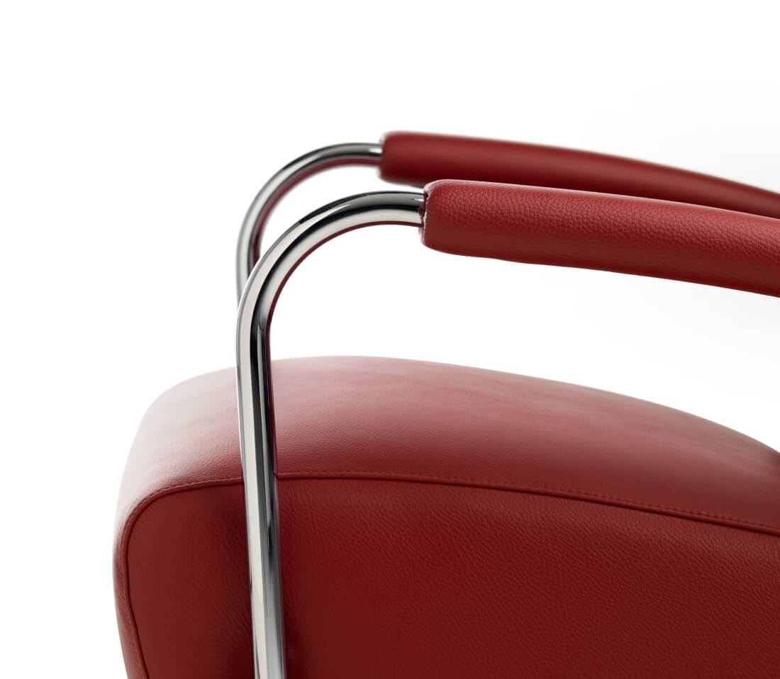 Het buizenframe dat rondom de zitting loopt is leverbaar in chroom, maar ook in diverse een epoxykleuren die Leolux LX in de collectie heeft. Er is een hoog mogel, een laag model en een bijpassend voetenbankje verkrijgbaar.