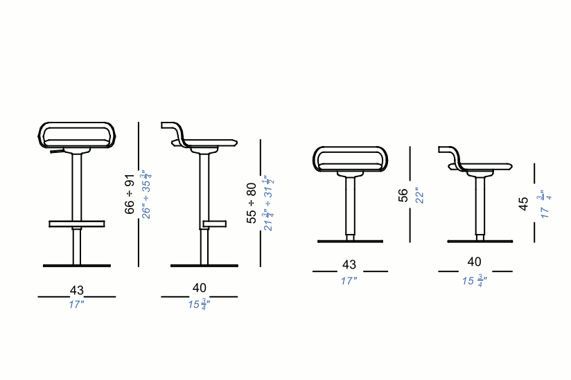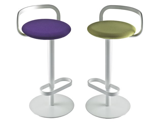 Draaikruk, fix of in hoogte verstelbaar met zwarte of witte poedercoating, metalen frame en zitting in stof of zacht leer.