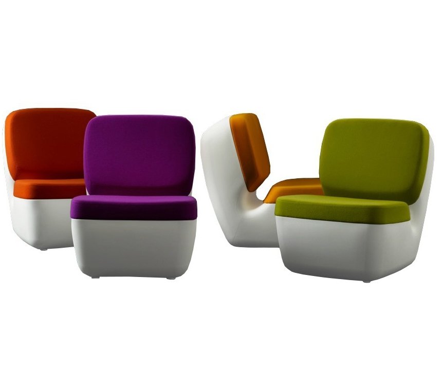 De Nimrod is ontworpen door Marc Newson voor Magis. Deze loungestoel heeft een witte, kunststof basis. Er zijn vier kleuren Kvadrat Divina 3 uitgekozen om de kussens mee te bekleden: oranje (542), paars (666), groen (936) en geel (426).