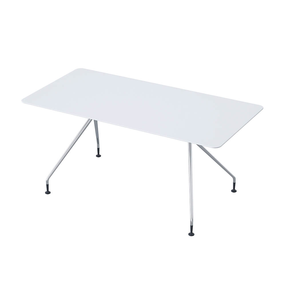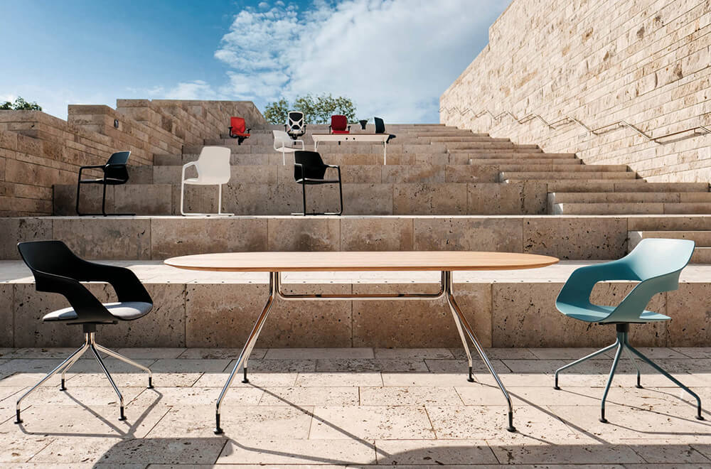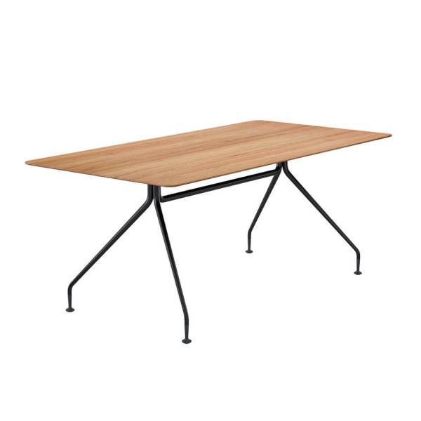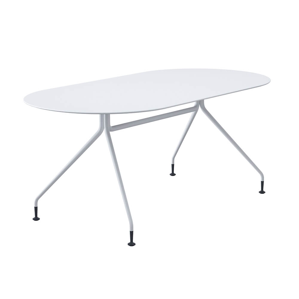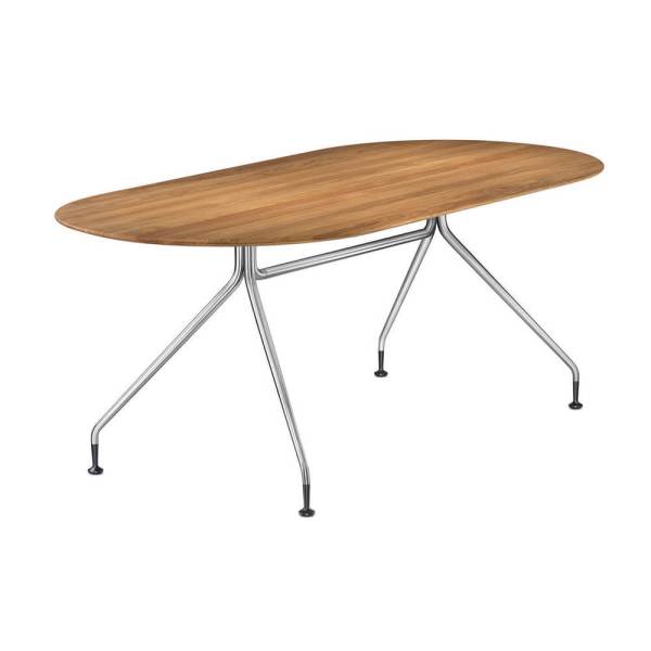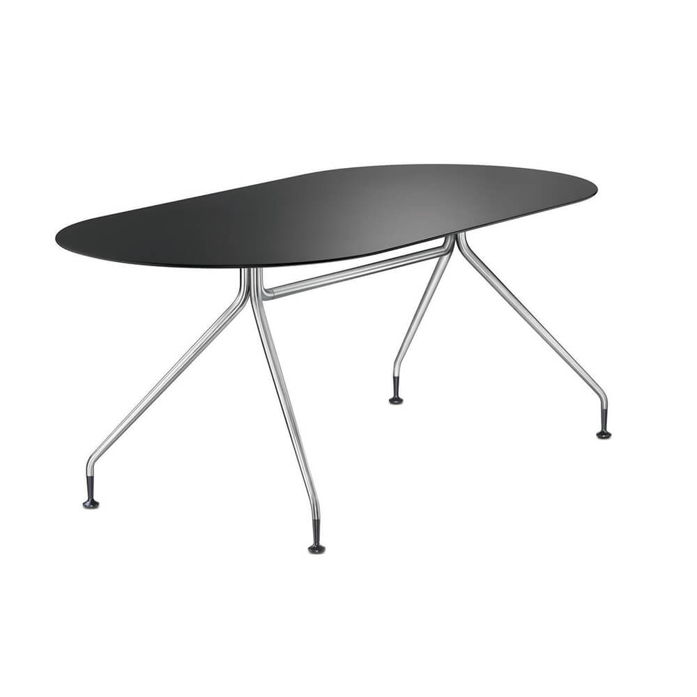 Deze tafel combineert organische vormen met strakke geometrie. Verkrijgbaar in vierkant, rechthoekig, rond en ovaal.