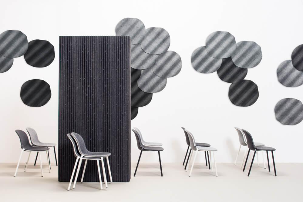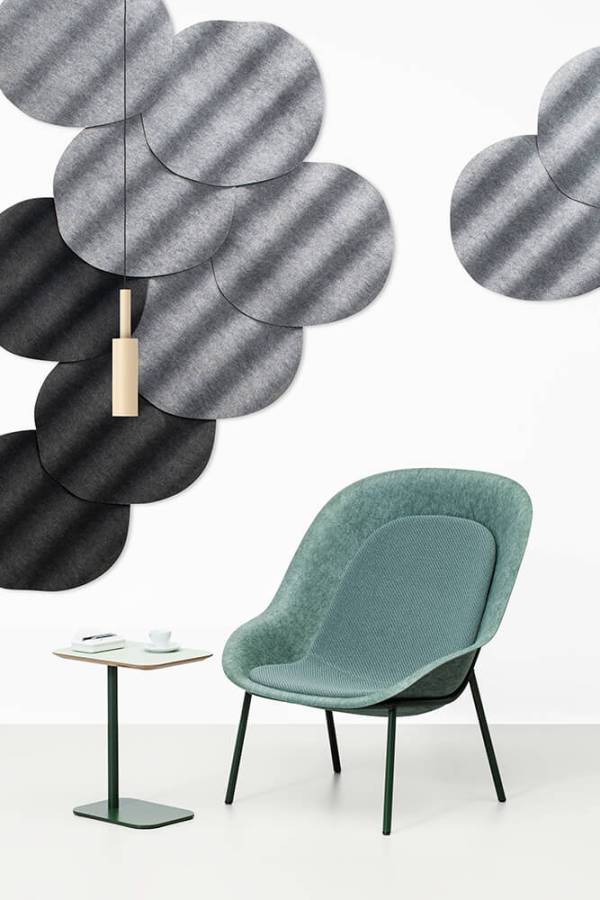 Onde biedt een perfecte combinatie van esthetiek en geluiddempende eigenschappen. De panelen worden geperst van gerecycled PET Felt materiaal en zijn vrij te plaatsen en te overlappen om zo een unieke compositie te creëren.