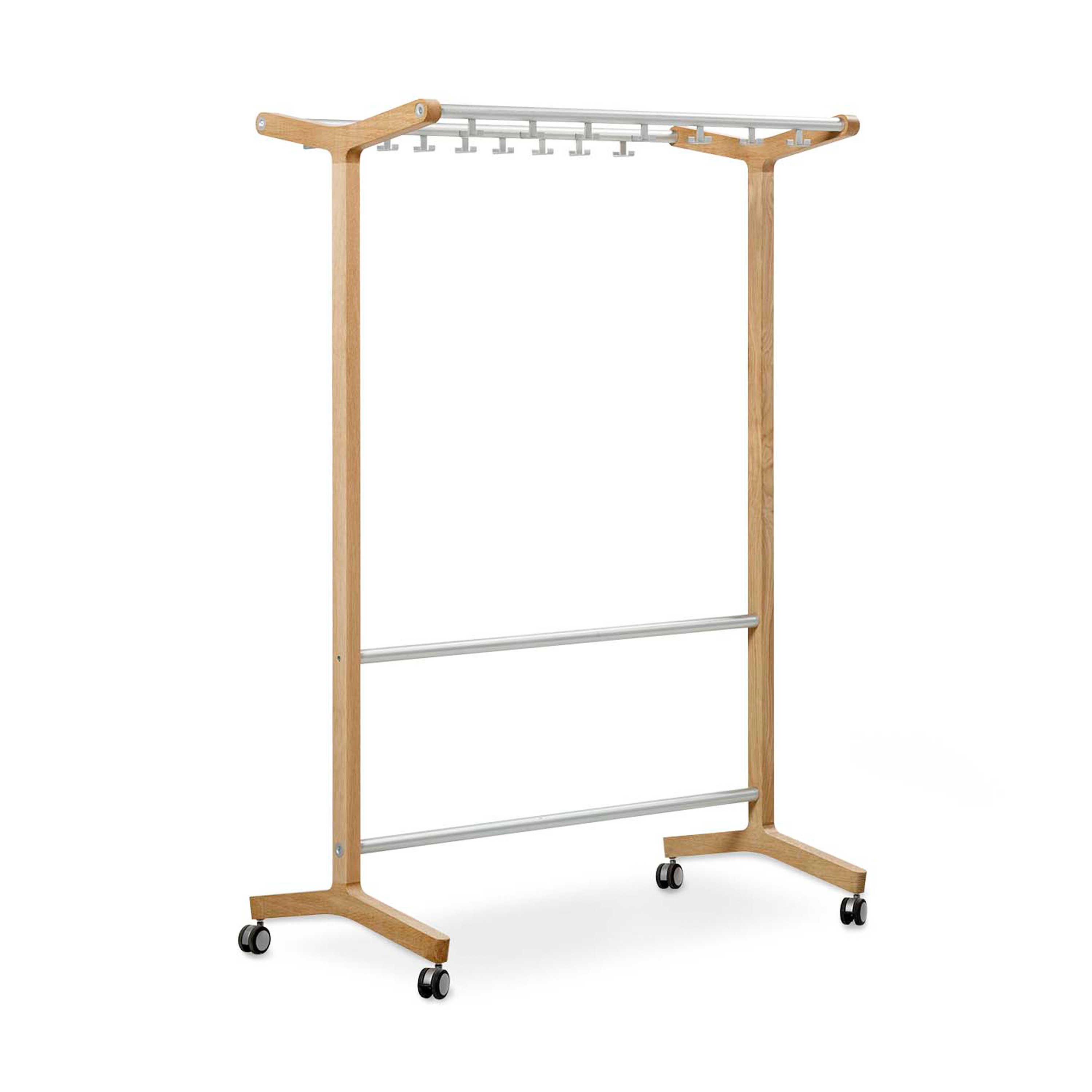 Het Round20 Double element biedt een dubbele ophangcapaciteit. De Round20 Double is verkrijgbaar in verschillende breedtes en kan ook aan elkaar gekoppeld worden. De houten staanders zijn verkrijgbaar in naturel eiken, zwart en wit, en kunnen worden voorzien van haken of kleerhangers.