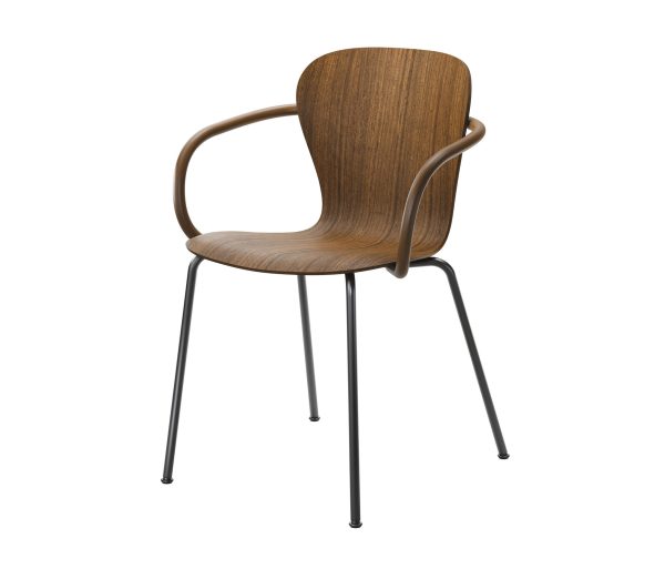 De stoel kenmerkt zich door een ingetogen organische vorm en een helder lijnenspel, terwijl de zitschaal van gebogen gelamineerd hout comfort en ondersteuning biedt.