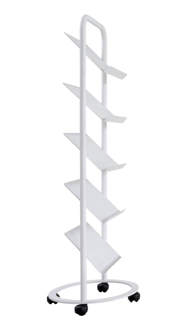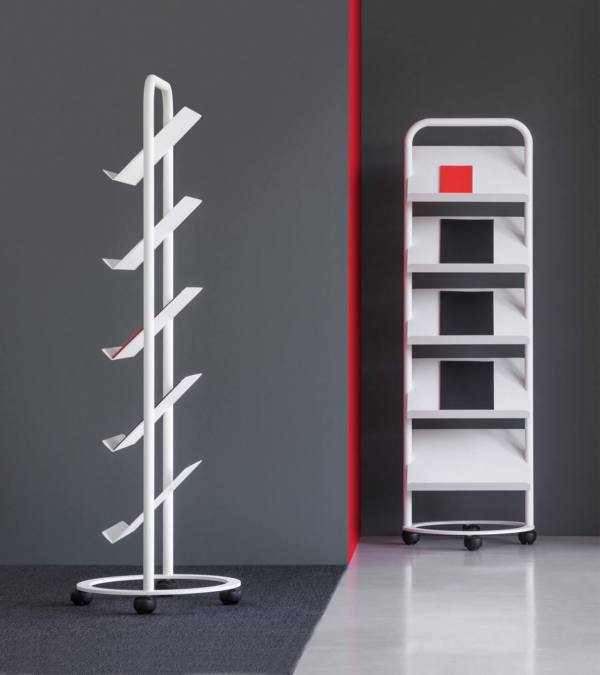 Brochurehouder Spring B1 is ontworpen door Pelikan & Co voor VanEsch. Deze display maakt deel uit van het flexibele garderobesysteem Spring. Evenals bij de andere onderdelen van dit door Pelikan & Co. ontworpen systeem valt de krachtige uitstraling op. De vijf robuuste legborden versterken dat beeld. Door de vier zwenkwielen is de brochurehouder gemakkelijk verplaatsbaar.