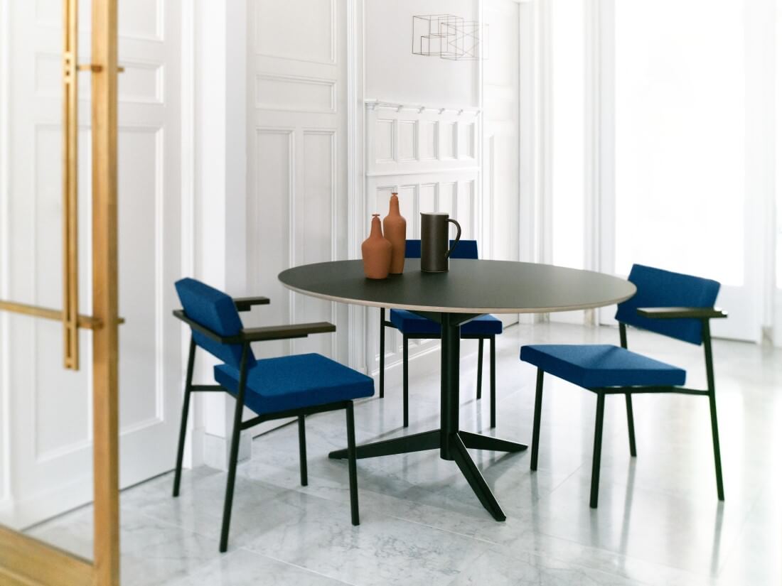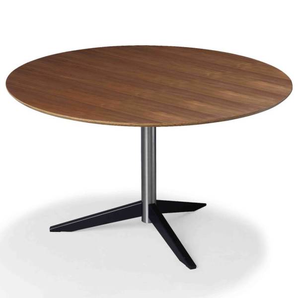 Afmetingen: Ø 130 x 74 cm (geschikt voor 4-5 stoelen). Tafelbladen tussen 110 – 140 cm zijn verkrijgbaar op aanvraag. Het onderstel is verkrijgbaar in epoxy zwart of mat verchroomd. De drie poten en drie dragers zijn altijd zwart gelakt.