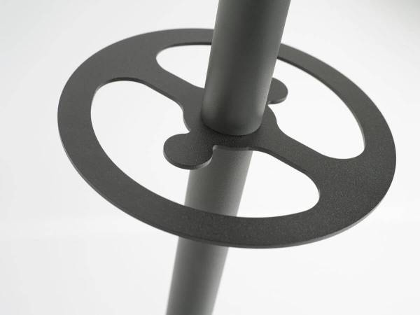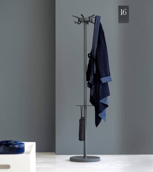 De Tertio Juno+ is ontworpen door Gerard Kerklaan voor VanEsch. De vrijstaande kapstok is gemaakt van geëpoxeerd staal en heeft ruimte voor twaalf jassen. De kolom en parapluring zijn vrkrijgbaar in een donkergrijze of metallicgrijze structuurlak.