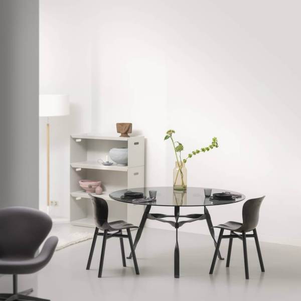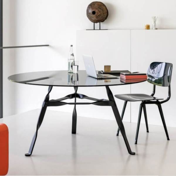 Twist van Functionals is een ontwerp van Thomas Schnur. De tafel bevat een onverwacht detail: een draai in de metalen poten en voet. Dit draaien maakt de tafel stabiel en interessanter. Het blad is uitgevoerd in transparant antraciet glas en het frame poedercoat zwart. De Twist kan gemakkelijk plaats bieden aan vier tot zes personen. Het is een prachtige eettafel of een vergadertafel in een kantoor.