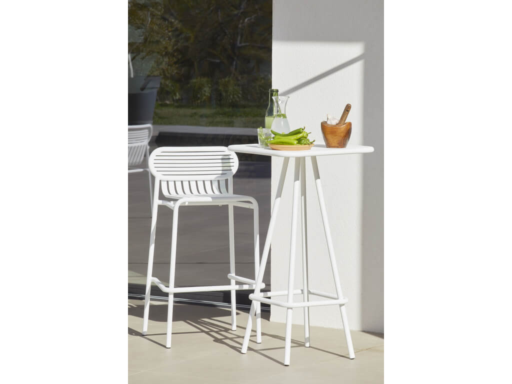 De High stool is een ontwerp van Studio BrichetZiegler voor de Week-End collectie van Petite Friture. De barkruk is onderdeel van een compleet assortiment tuinmeubilair waar de ovale en ronde vormen in combinatie met de contrasterende lamellen samen een grafisch geheel vormen.