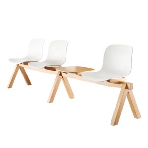 Pyramid bench van Hay is een ontwerp van Wim Rietveld. Deze bankvariant heeft een dunne basis van plaatstaal met een rechthoekige eikenhouten top die dezelfde functionele en overzichtelijke expressie heeft als de rest van de Pyramid-collectie. De schone esthetiek van de bank en de lichte, slijtvaste kwaliteit maken hem geschikt voor gebruik in vele huishoudelijke of zakelijke contexten.