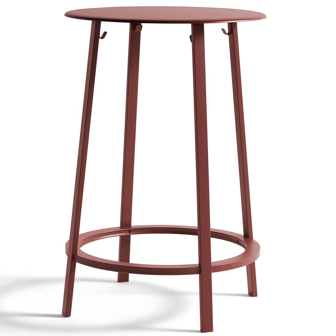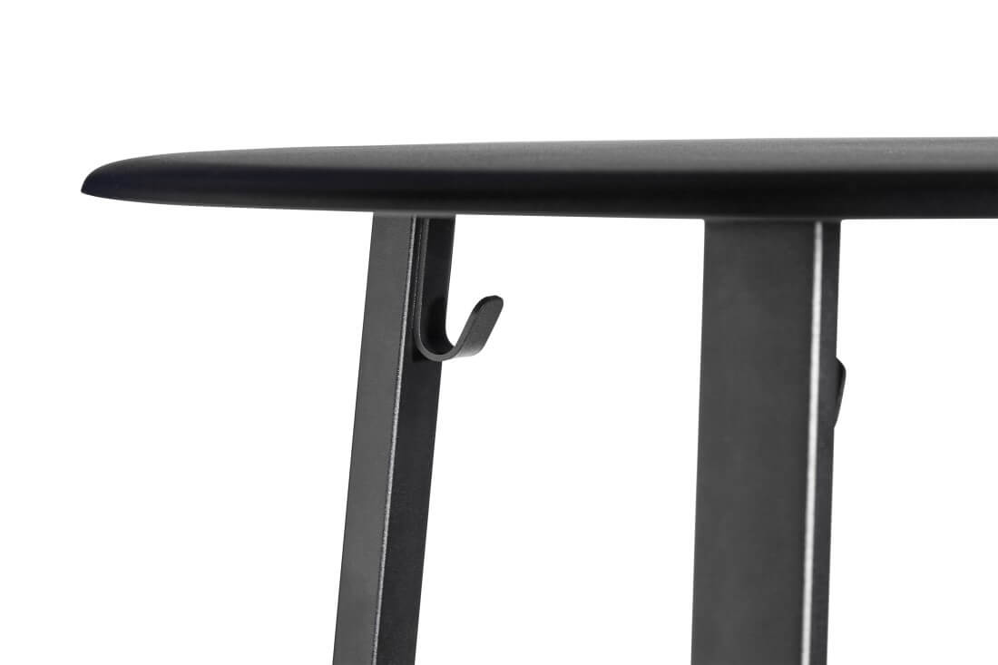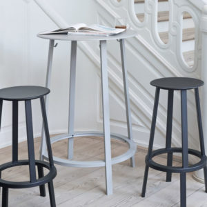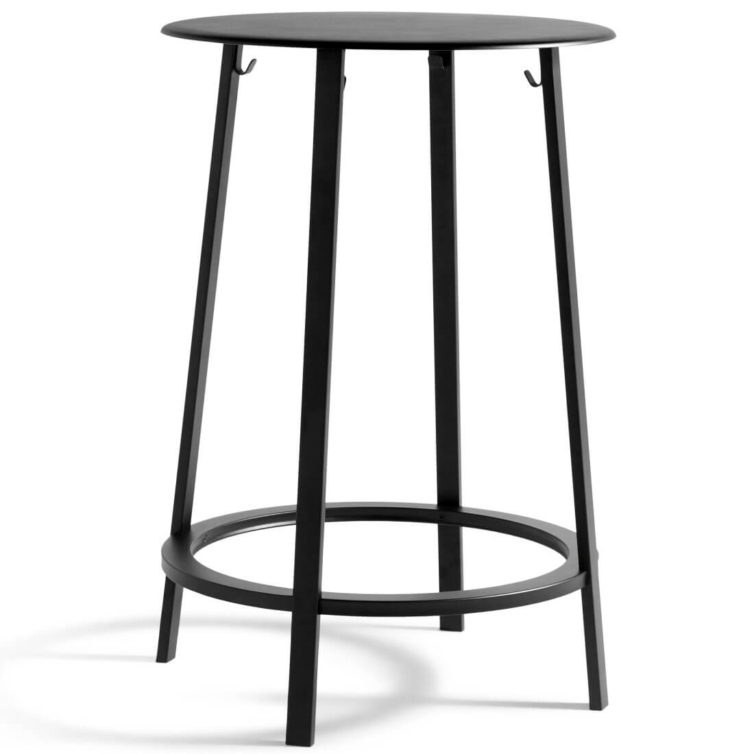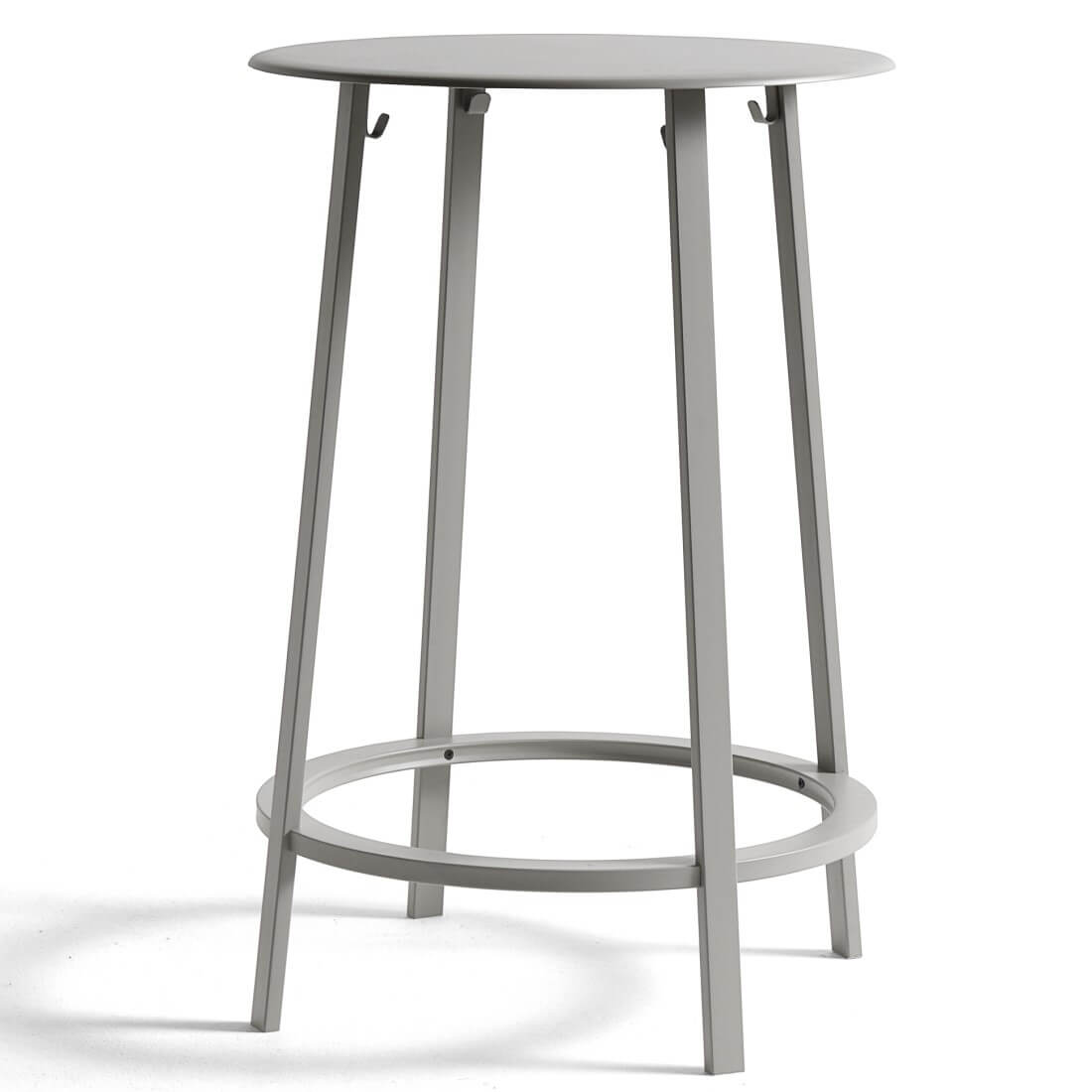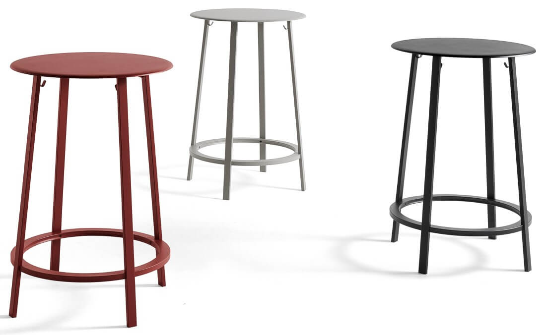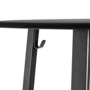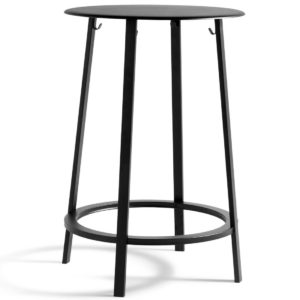 Qua functionaliteit biedt de ronde voetsteun ondersteuning, terwijl haken aan de tafelpoten zorgen dat jassen en tassen er veilig onder kunnen worden gehangen. De tafel is verkrijgbaar in drie verschillende kleuren. Geschikt voor diverse type ruimtes waaronder cafés en restaurants. De tafel is gemaakt van gepoedercoat staal.