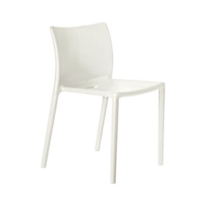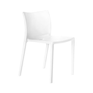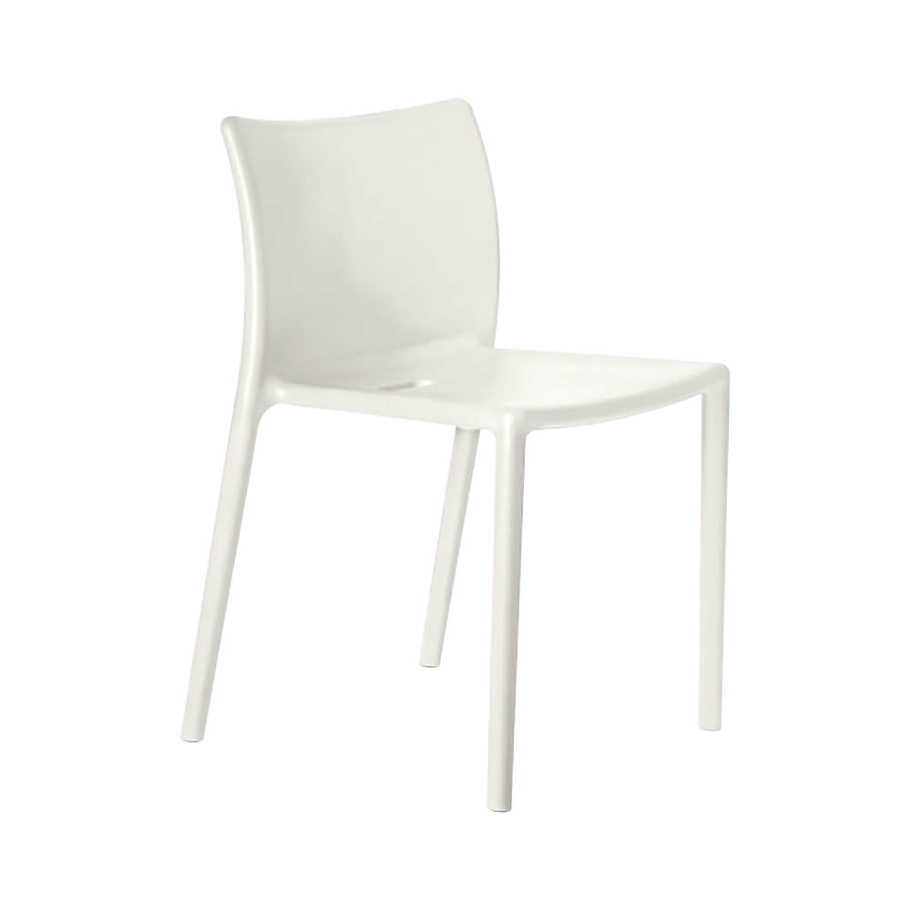 De kunststof stoel is verkrijgbaar in het wit, oranje, groen, beige, puur wit en zwart. In de Air collectie van Magis zitook een armstoel, klapstoel en tafel.