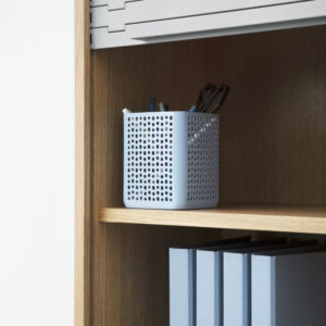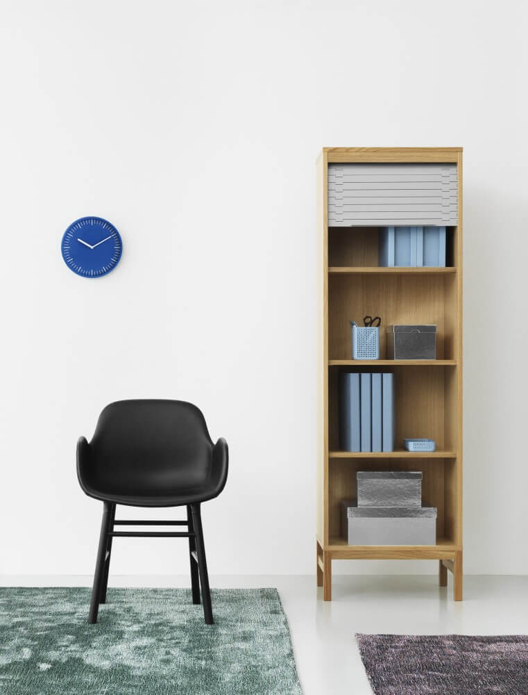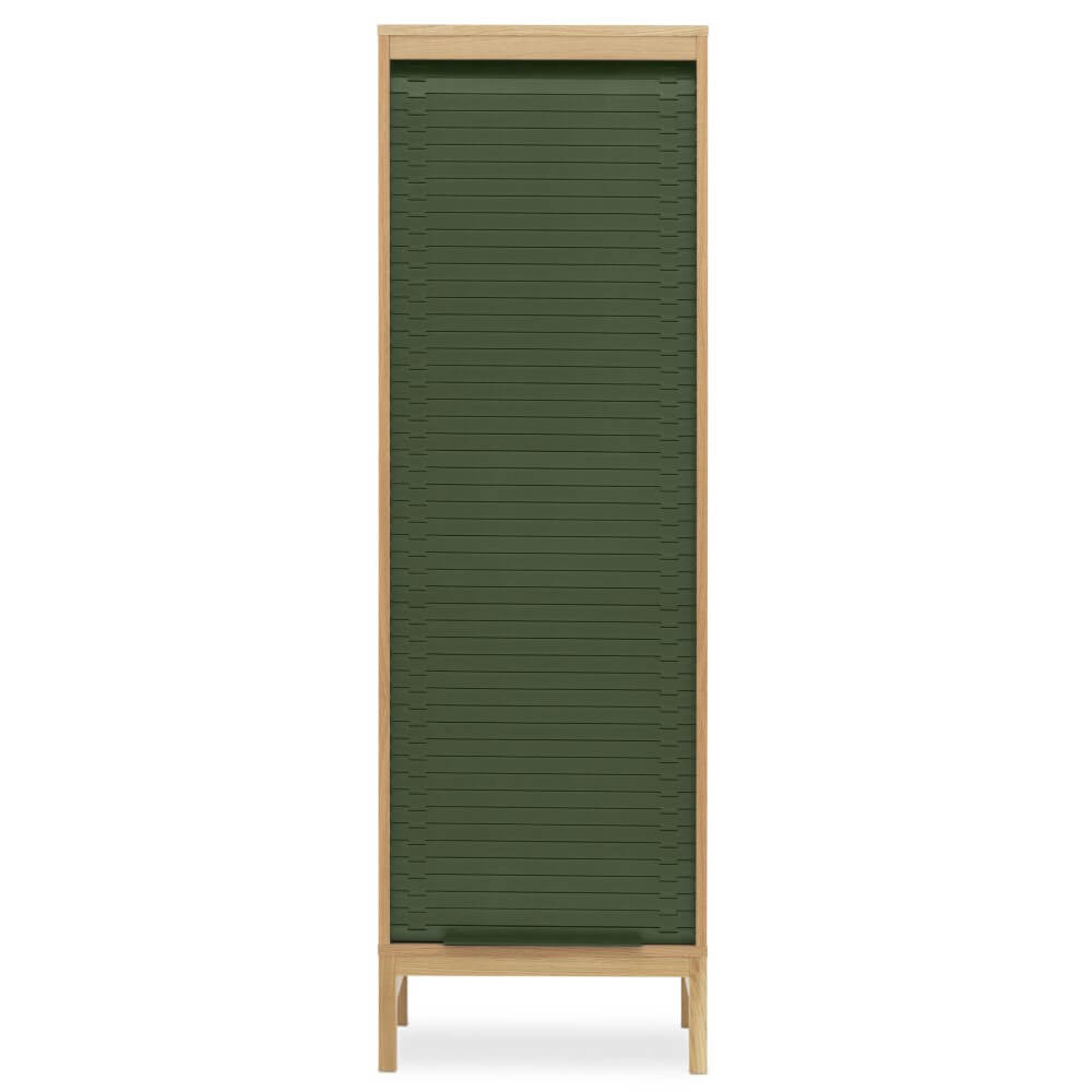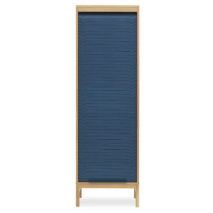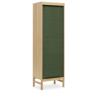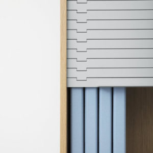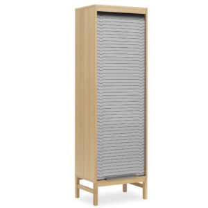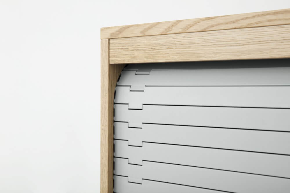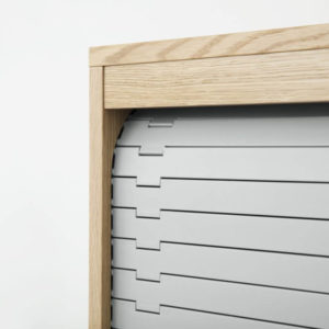 De Jalousi high van Normann Copenhagen is ontworpen door Simon Legald. Inspiratie voor deze roldeurkast haalde hij onder andere uit horloges, transportbanden en meubels uit de jaren 50.