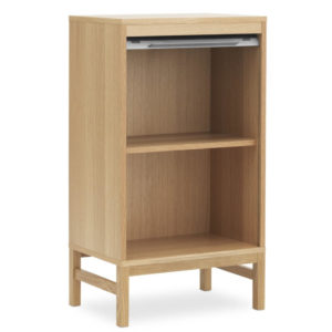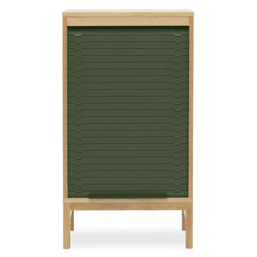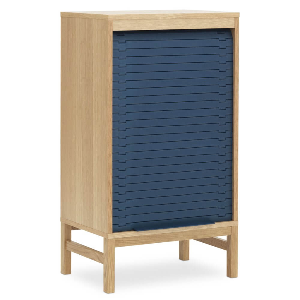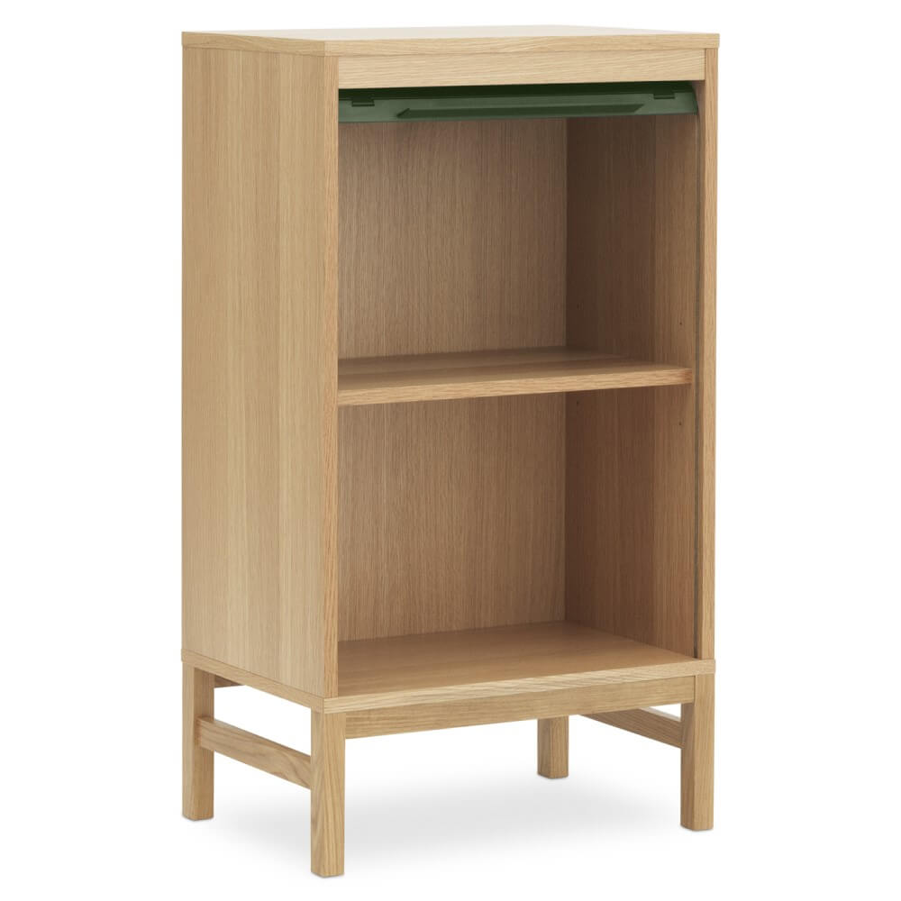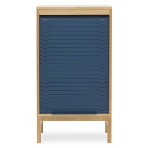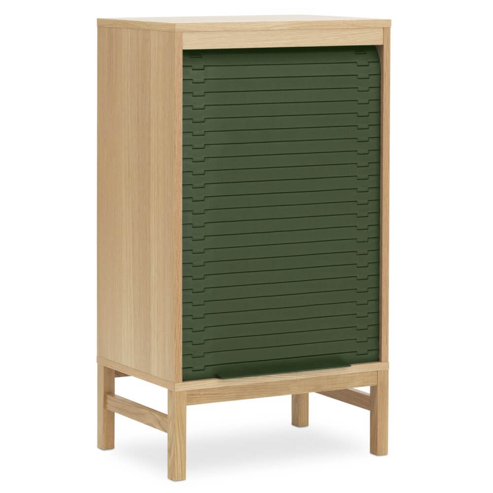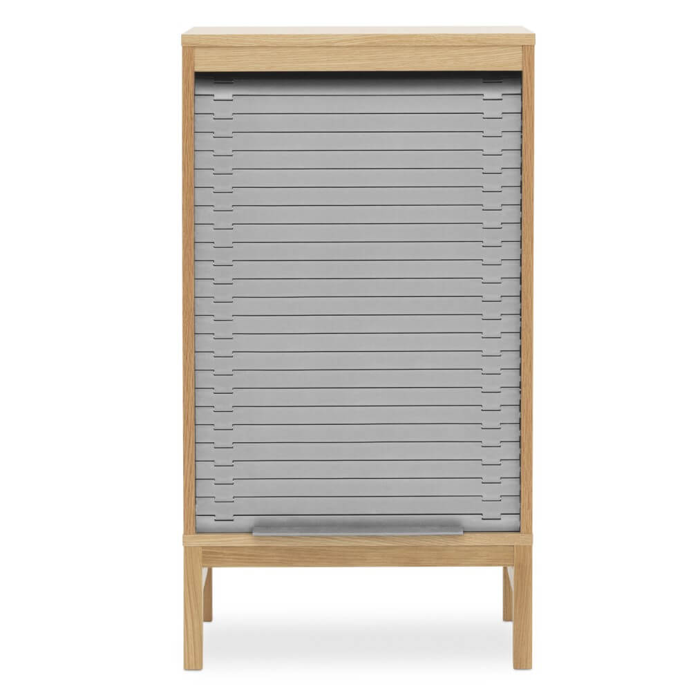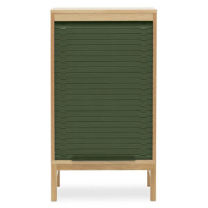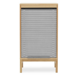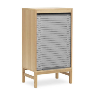 De Jalousi low van Normann Copenhagen is ontworpen door Simon Legald. Inspiratie voor dit roldeurkastje haalde hij onder andere uit transportbanden, horloges en meubels uit de jaren 50.