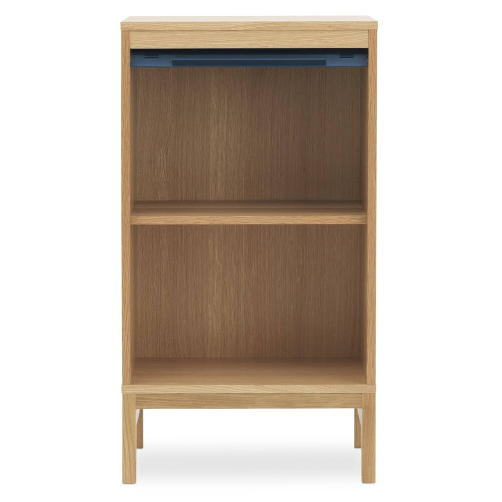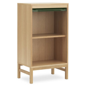 Het frame is gemaakt van MDF met gelakt eiken fineer met massief eikenhouten poten. De kunststof roldeur is verkrijgbaar in drie kleuren: grijs, donkerblauw en donkergroen. De planken kunnen naar eigen wens worden ingedeeld. Hierdoor is de lage Jalousi geschikt voor zowel op de werkvloer als in huis.