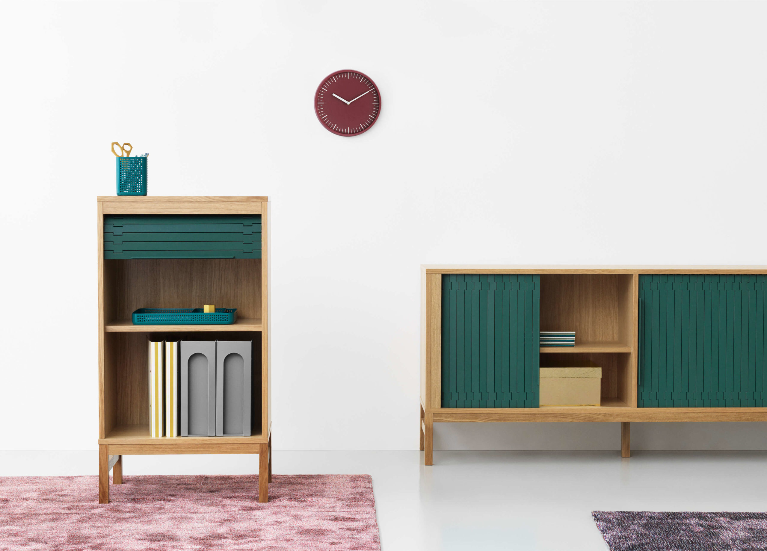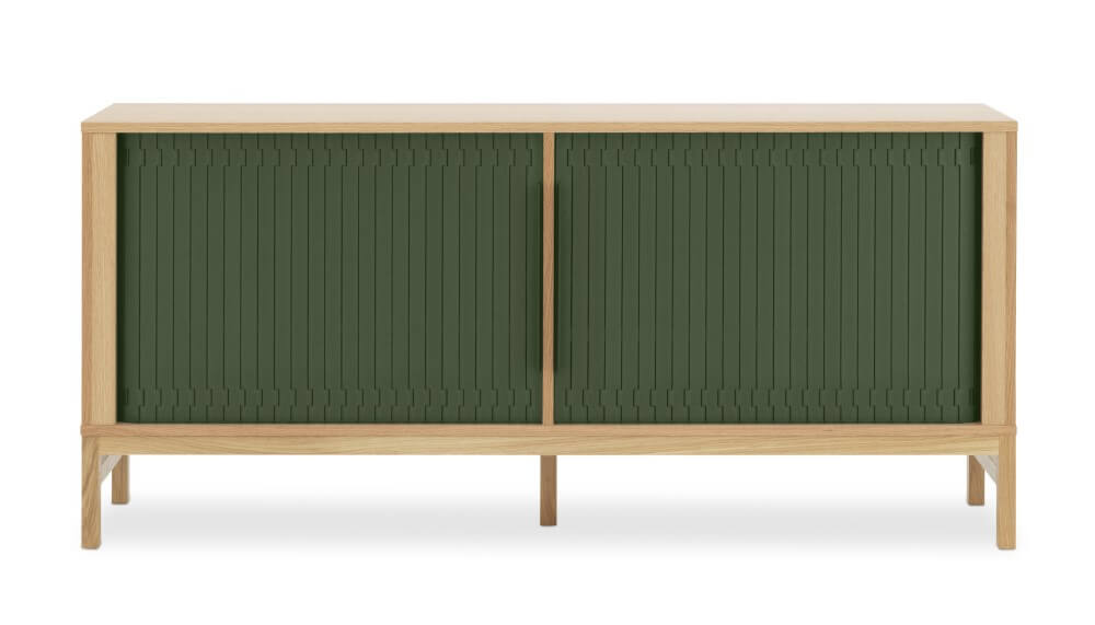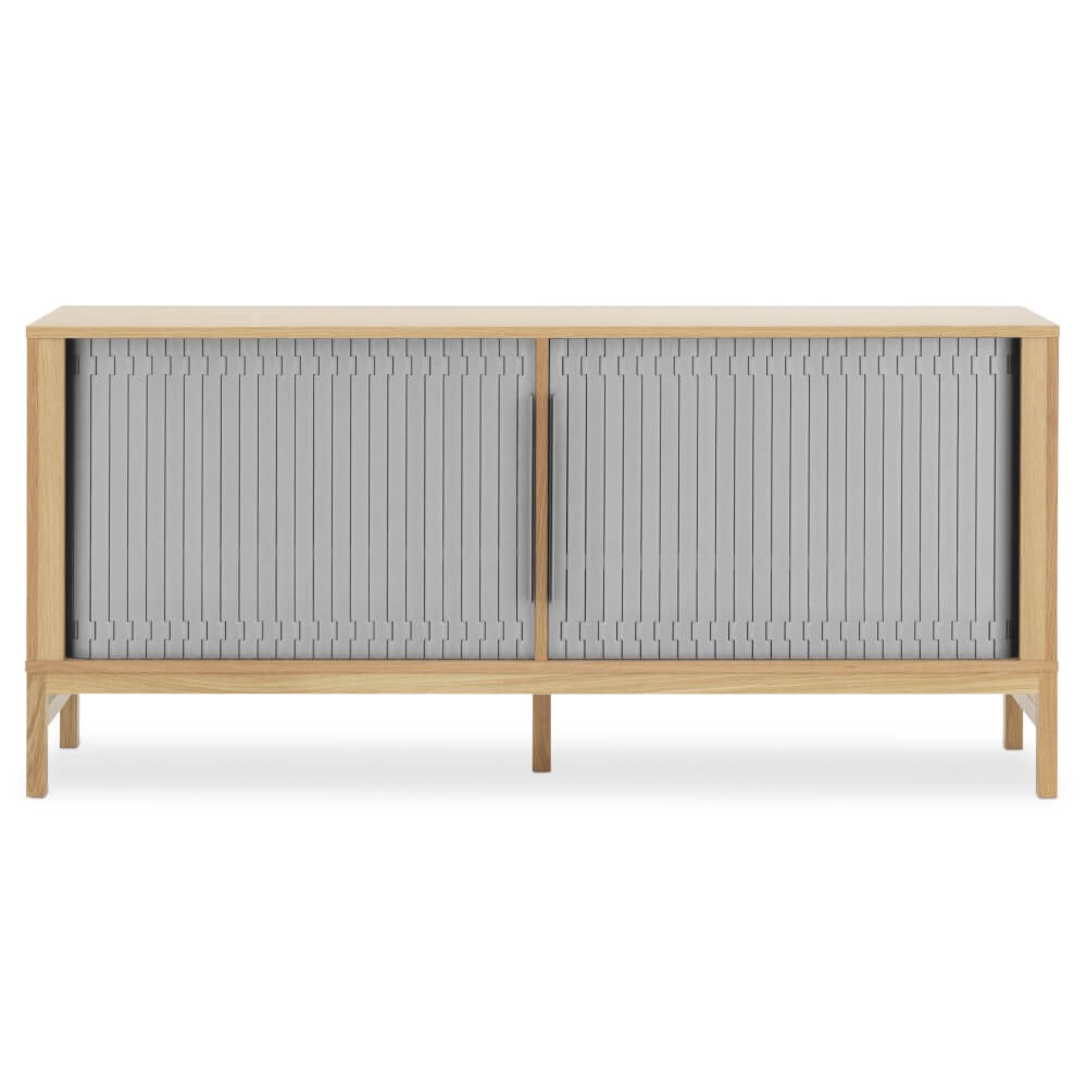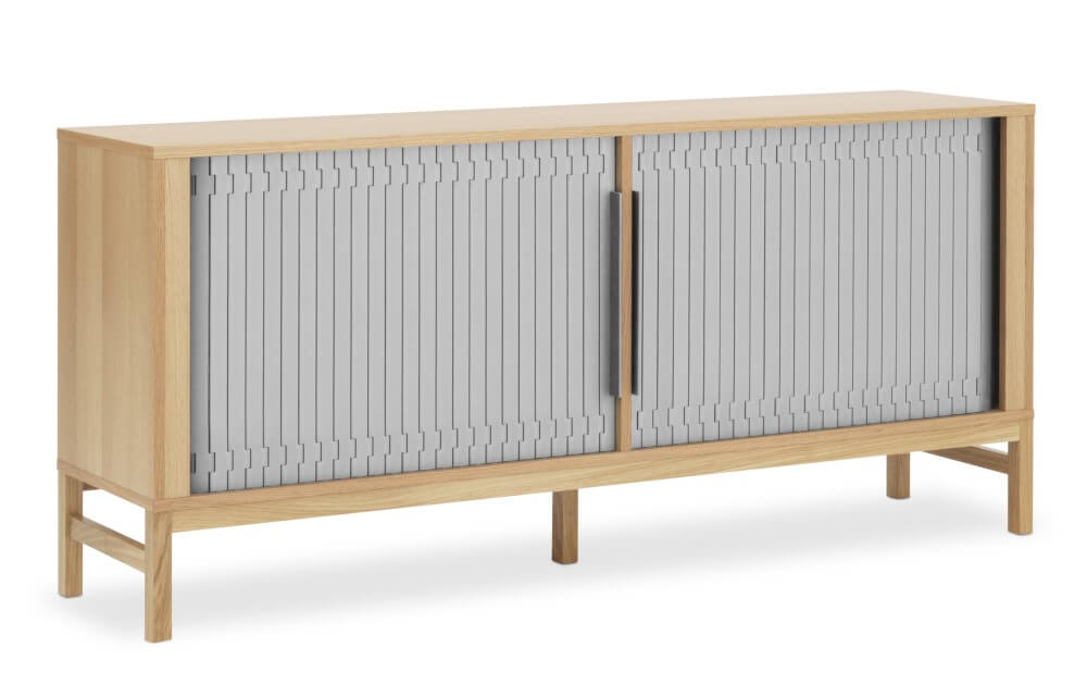 Het Jalousi sideboard van Normann Copenhagen is ontworpen door Simon Legald. Inspiratie voor dit dressoir haalde hij uit voorwerpen zoals horloges en transportbanden uit de jaren 50. De planken kunnen naar eigen wens worden ingedeeld. Hierdoor is het Jalousi sideboard geschikt voor zowel op de werkvloer als in huis.