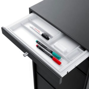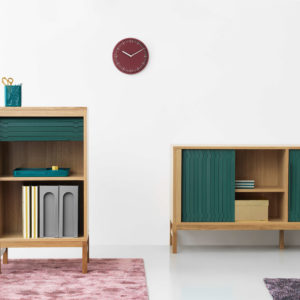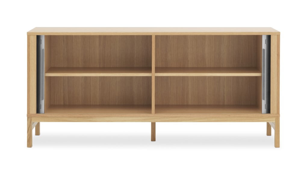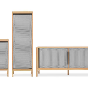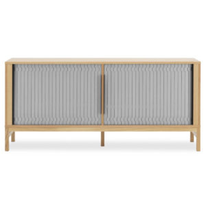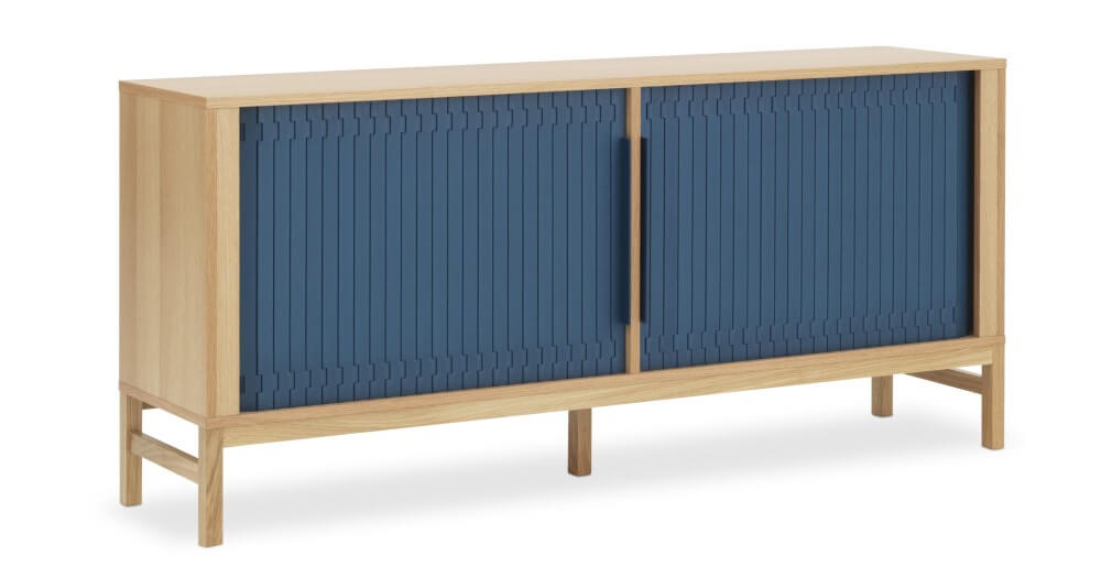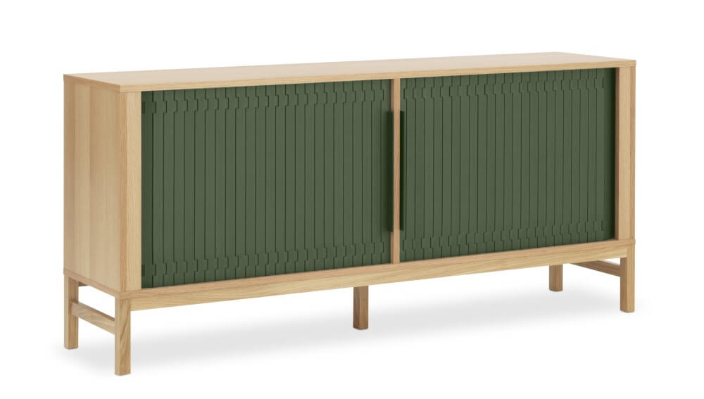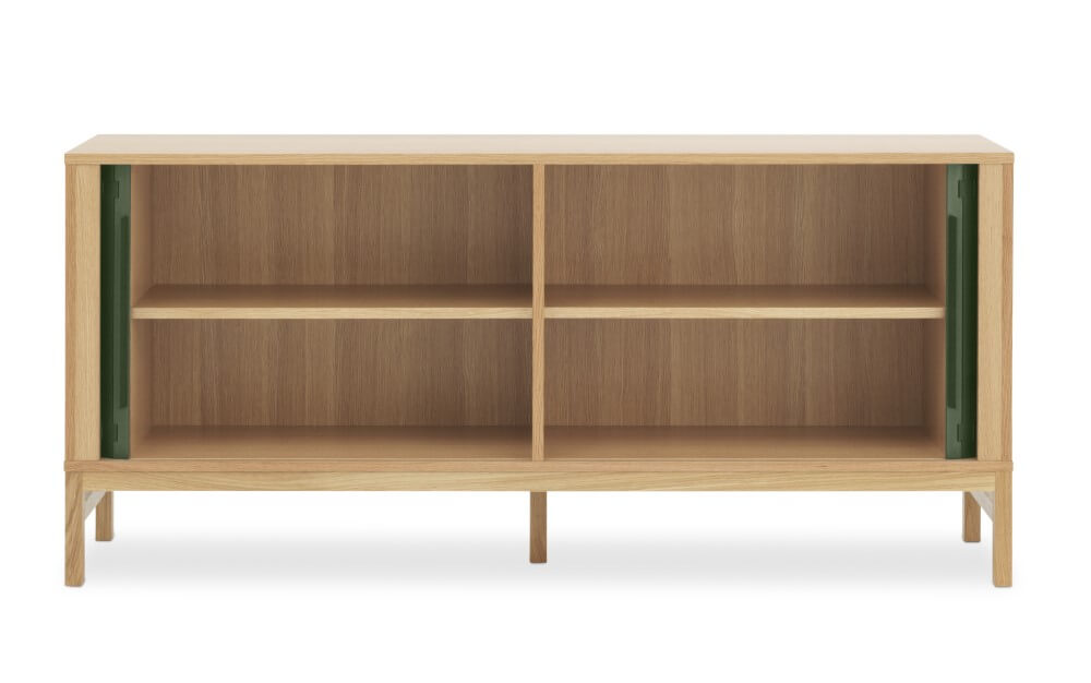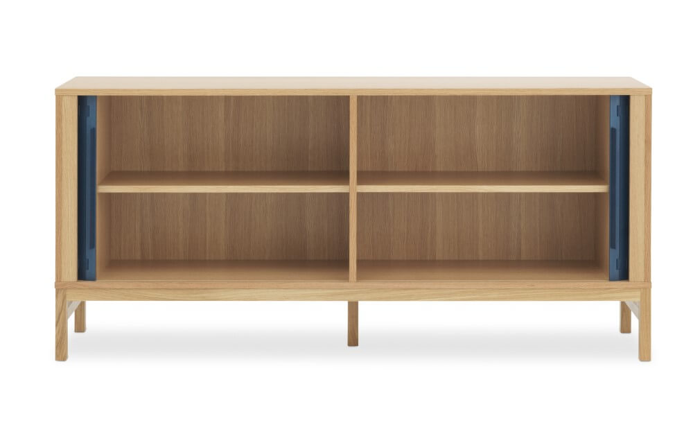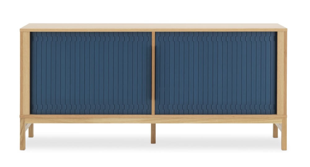 Het Jalousi sideboard van Normann Copenhagen is ontworpen door Simon Legald. Inspiratie voor dit dressoir haalde hij uit voorwerpen zoals horloges en transportbanden uit de jaren 50. De planken kunnen naar eigen wens worden ingedeeld. Hierdoor is het Jalousi sideboard geschikt voor zowel op de werkvloer als in huis.