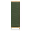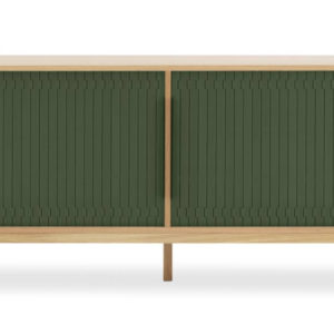 Het frame is gemaakt van MDF met gelakt eiken fineer met massief eikenhouten poten. De kunststof roldeur is verkrijgbaar in drie kleuren: grijs, donkerblauw en donkergroen.